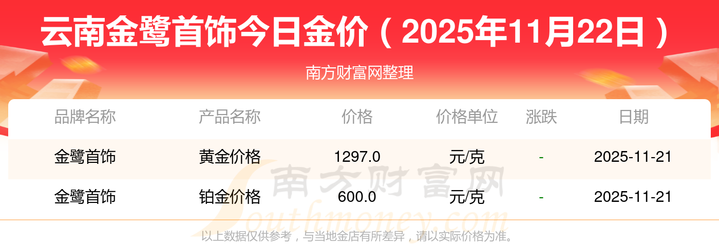 今日黄金价格查询_现在金价黄金一克多少钱,黄金价格是多少钱一克?2025年11月22日云南金鹭首饰一克黄金对应的价格是多少?黄金价格1305.0元/克,铂金价格616.0元/克,饰品金价(内地)1305.0元/克,黄金饰品(香港)45110.0,铂金价格(香港)17570.0,金条价格(香港)40690.0,金条金价(内地)1143.0元/克,黄金价格1298.0元/克,铂金价格600.0元/克,足金价格1298.0元/克,黄金价格1266.0元/克。