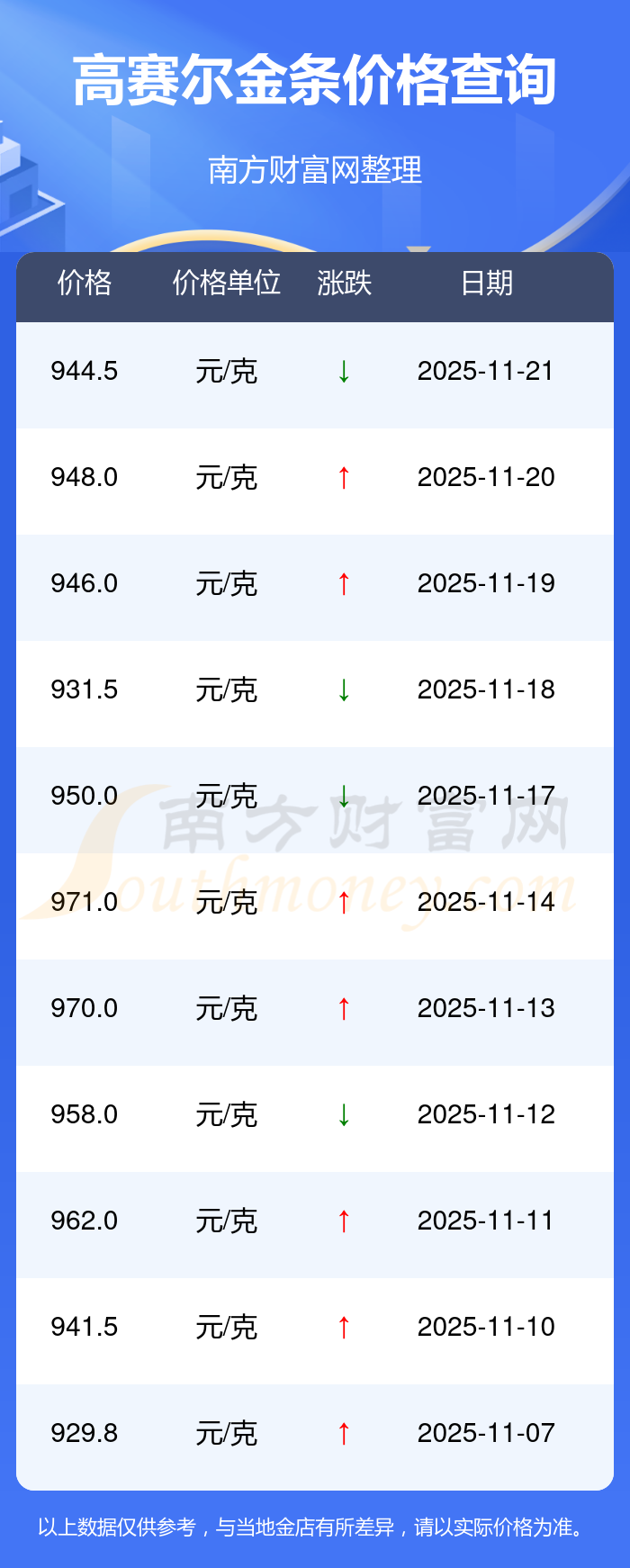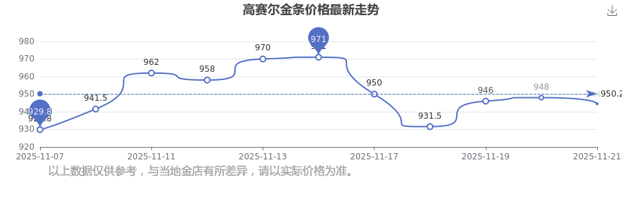 今日(2025年11月22日)高赛尔金条价格是944.5元/克。