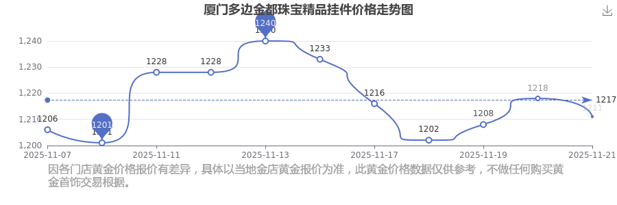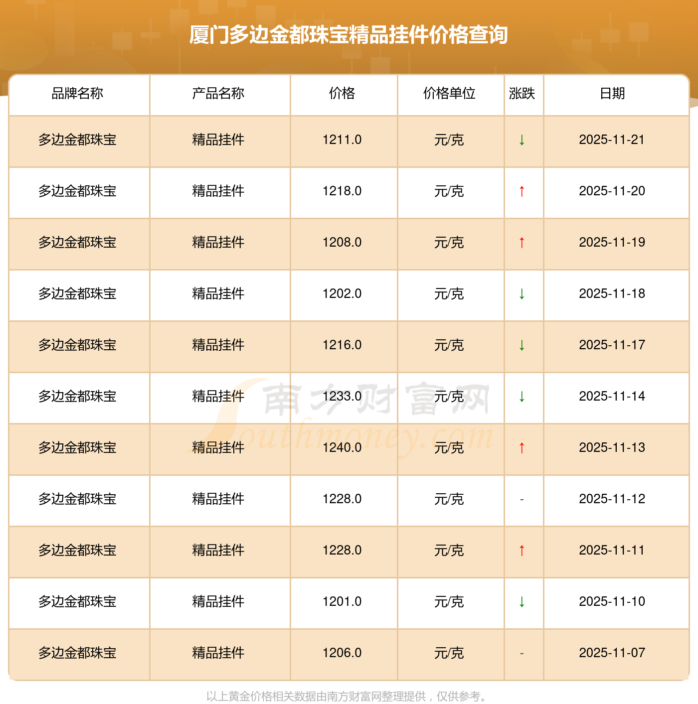 1211.0元/克,这是厦门多边金都珠宝于 2025年11月22日所定的精品挂件价格。