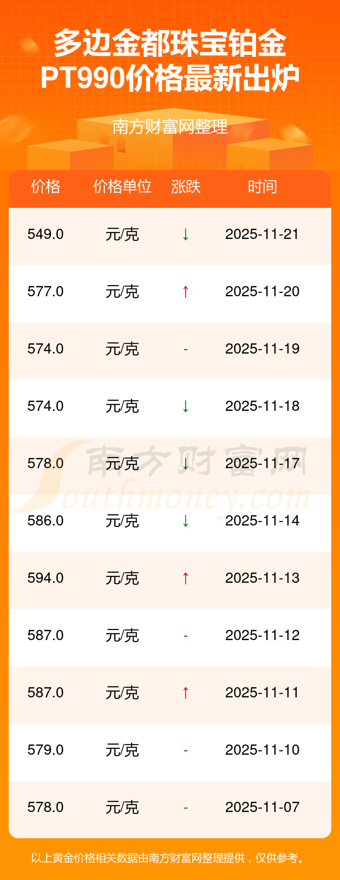 多边金都珠宝今日铂金PT990的最新市场行情价为549.0元/克。