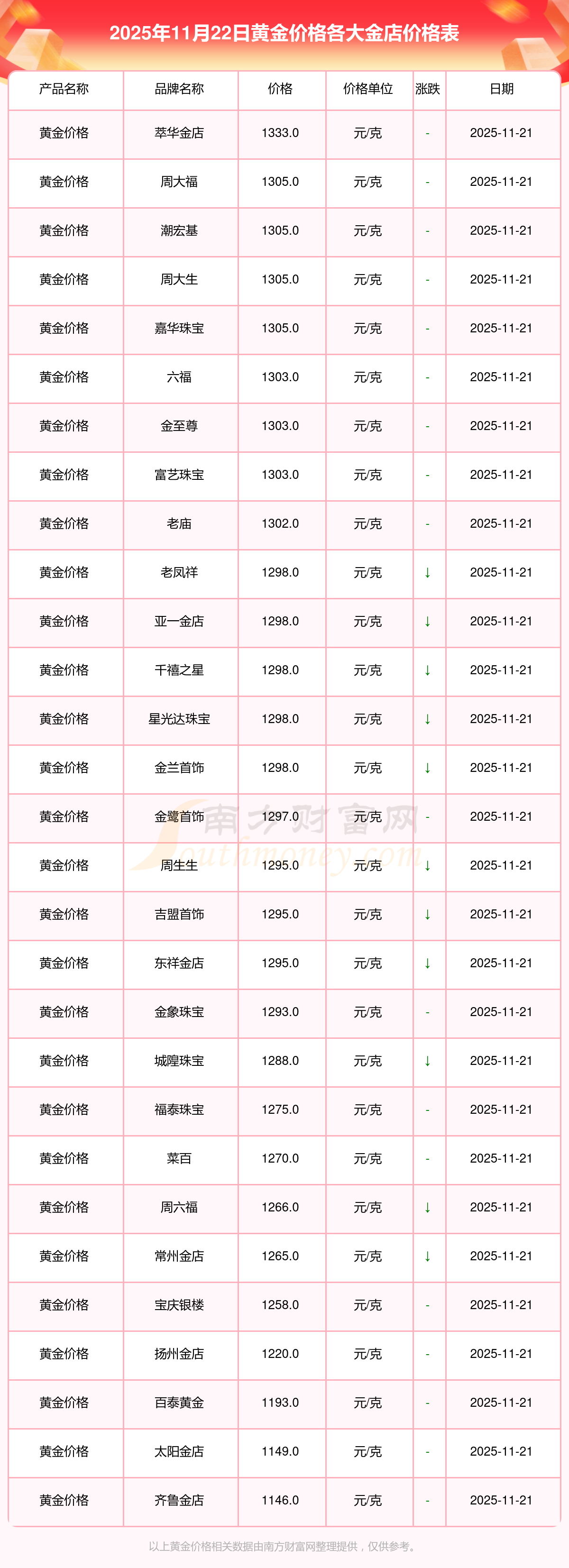 今天是2025年11月22日,周大福、周大福、周大福、周大福、周大福、周大福、周大福、老凤祥、老凤祥、老凤祥、周六福等各大金店品牌黄金价格最新价格如下:周大福1305.0元/克、周大福616.0元/克、周大福1305.0元/克、周大福45110.0、周大福17570.0、周大福40690.0、周大福1143.0元/克、老凤祥1298.0元/克、老凤祥600.0元/克、老凤祥1298.0元/克、周六福1266.0元/克。