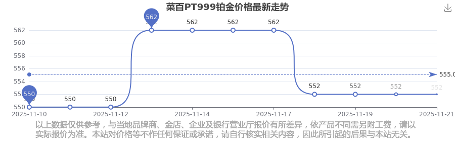 今日(2025年11月22日),菜百PT999铂金最新价格为552.0元/克。