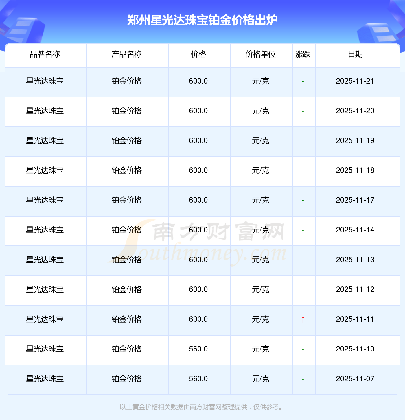 郑州星光达珠宝铂金价格在 2025年11月22日为 600.0元/克。
