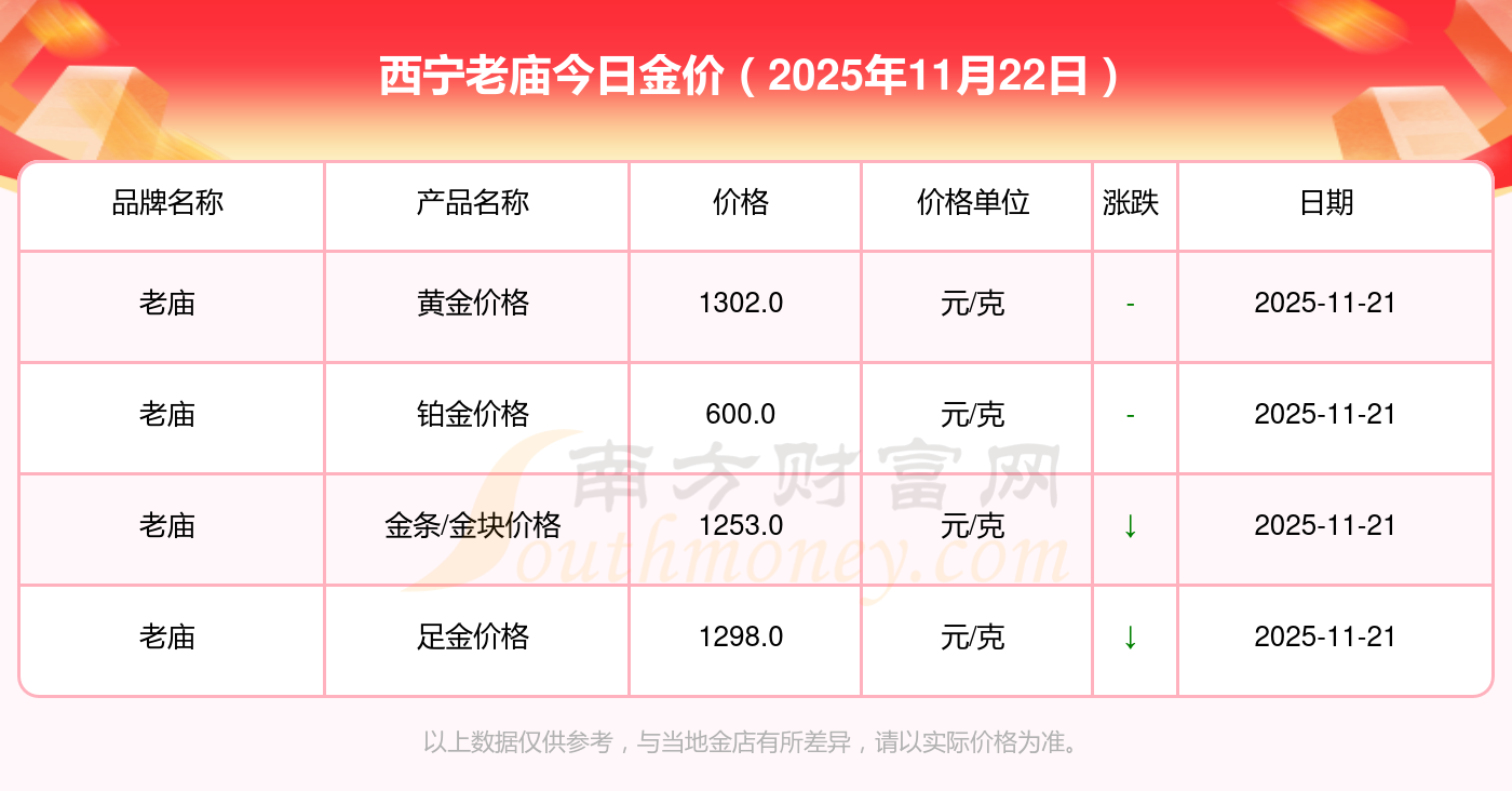 2025年11月22日西宁老庙今日价格:黄金价格1305.0元/克,铂金价格616.0元/克,饰品金价(内地)1305.0元/克,黄金饰品(香港)45110.0,铂金价格(香港)17570.0,金条价格(香港)40690.0,金条金价(内地)1143.0元/克,黄金价格1298.0元/克,铂金价格600.0元/克,足金价格1298.0元/克,黄金价格1266.0元/克。