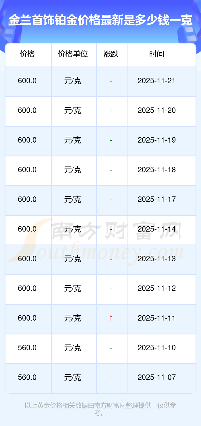 金兰首饰 铂金价格在今日更新至600.0元/克。