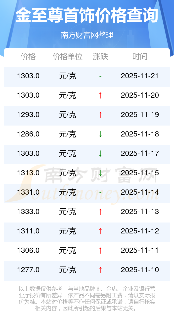 今日金至尊 首饰最新的市场标价为1303.0元/克。