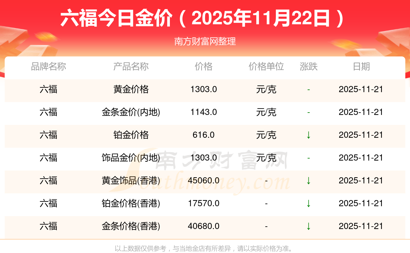 2025年11月22日六福今日黄金价格查询(一克金子的市场价格查询),一起来看看吧!