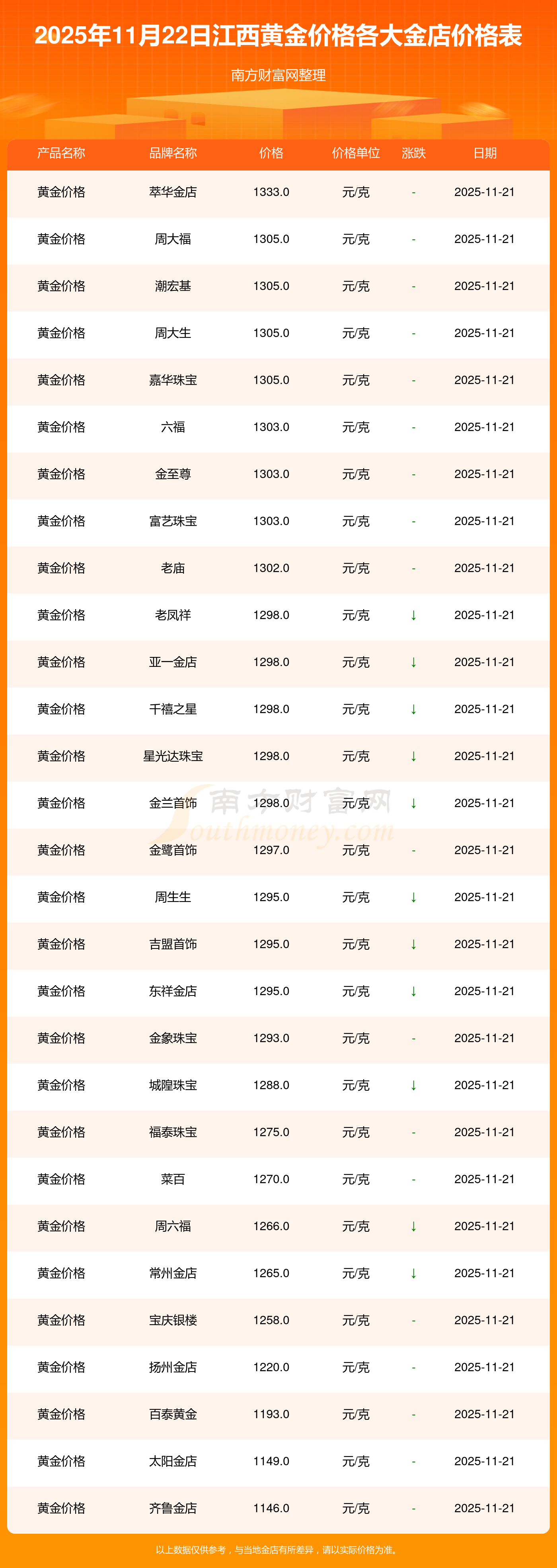 2025年11月22日江西各大金店黄金价格最新价格查询来了:周大福1305.0元/克,周大福616.0元/克,周大福1305.0元/克,周大福45110.0,周大福17570.0,周大福40690.0,周大福1143.0元/克,老凤祥1298.0元/克,老凤祥600.0元/克,老凤祥1298.0元/克,周六福1266.0元/克。