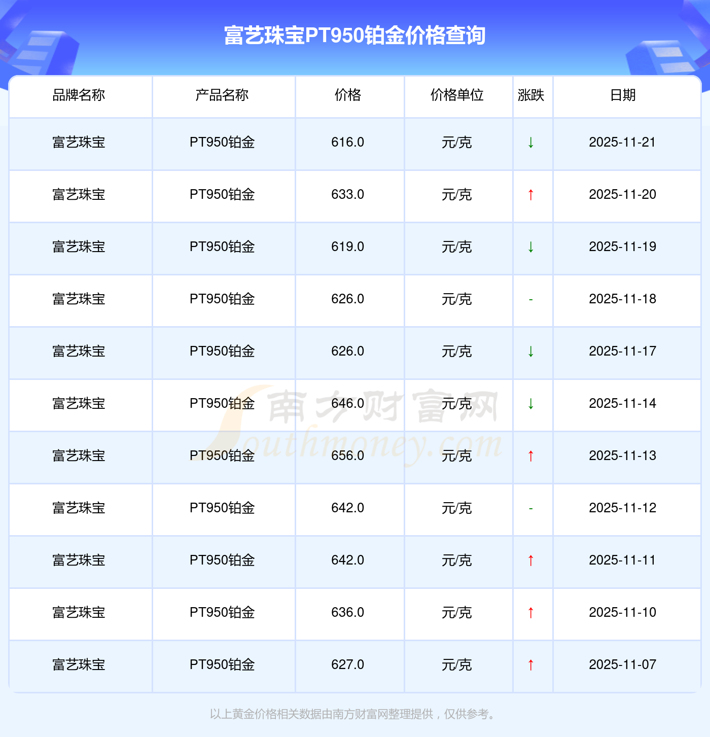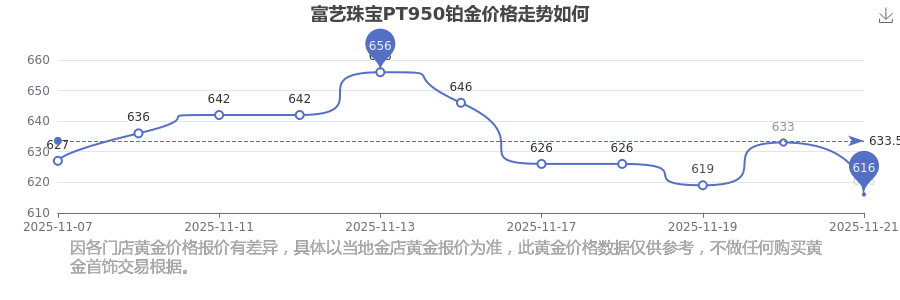 富艺珠宝 PT950铂金于今日的最新挂牌价为616.0元/克。