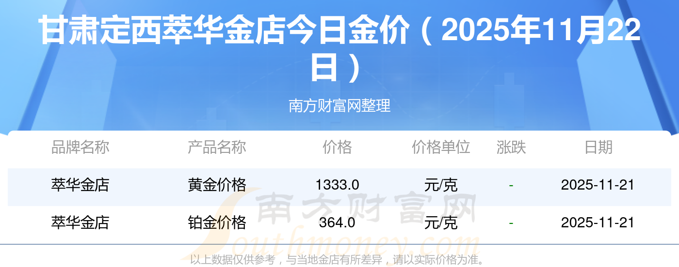 今天黄金价格行情怎样?此刻每克黄金售价多少?2025年11月22日甘肃定西萃华金店一克黄金的售价是多少:黄金价格1305.0元/克,铂金价格616.0元/克,饰品金价(内地)1305.0元/克,黄金饰品(香港)45110.0,铂金价格(香港)17570.0,金条价格(香港)40690.0,金条金价(内地)1143.0元/克,黄金价格1298.0元/克,铂金价格600.0元/克,足金价格1298.0元/克,黄金价格1266.0元/克。