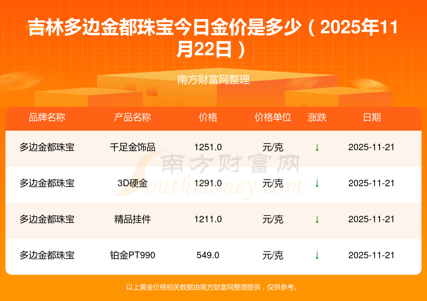 2025年11月22日吉林多边金都珠宝黄金的单价,一克为多少?黄金价格1305.0元/克,铂金价格616.0元/克,饰品金价(内地)1305.0元/克,黄金饰品(香港)45110.0,铂金价格(香港)17570.0,金条价格(香港)40690.0,金条金价(内地)1143.0元/克,黄金价格1298.0元/克,铂金价格600.0元/克,足金价格1298.0元/克,黄金价格1266.0元/克。