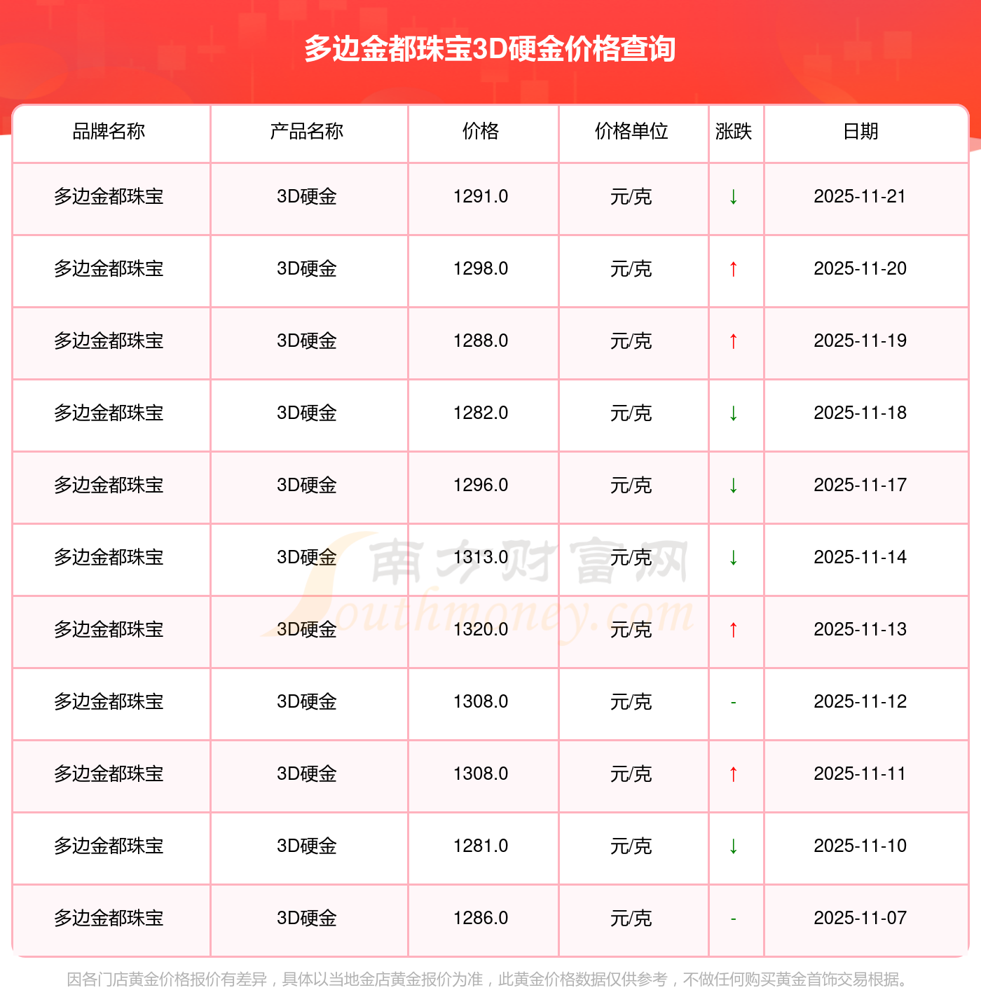 当下,多边金都珠宝 3D硬金今日的最新价格是1291.0元/克。