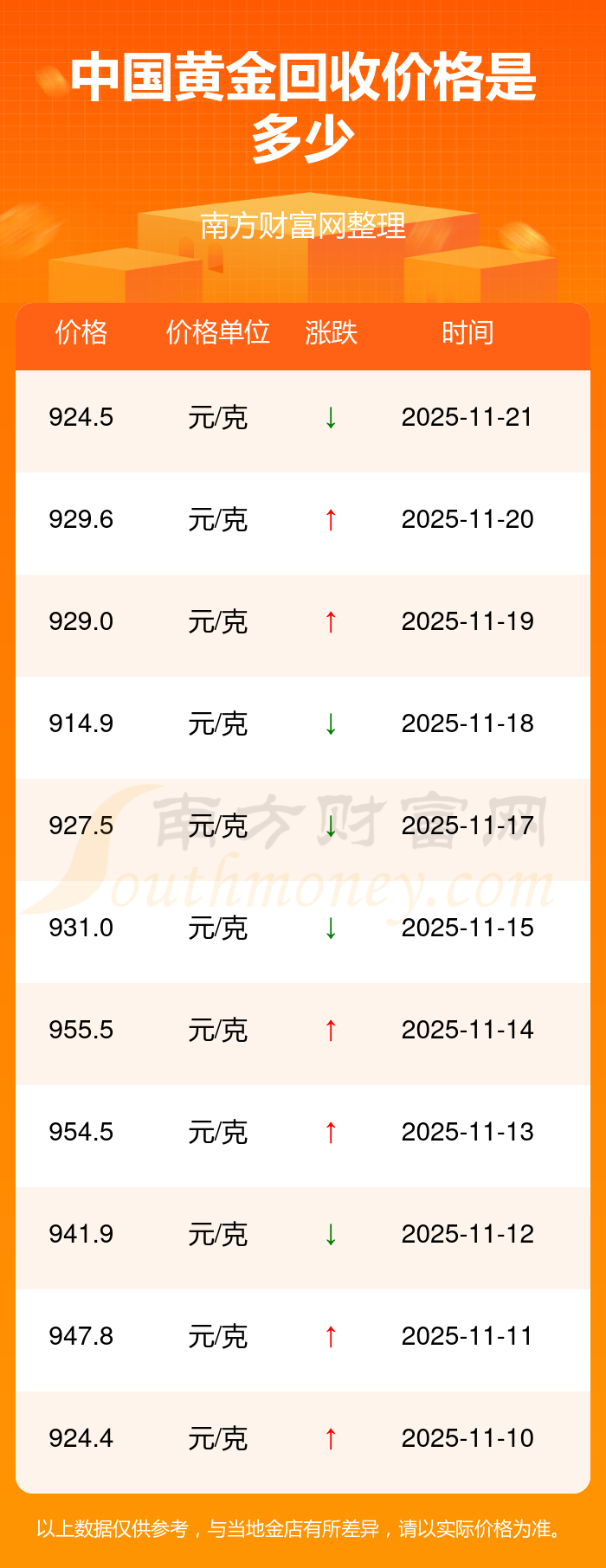 今日(2025年11月22日)中国黄金回收价格为924.5元/克。