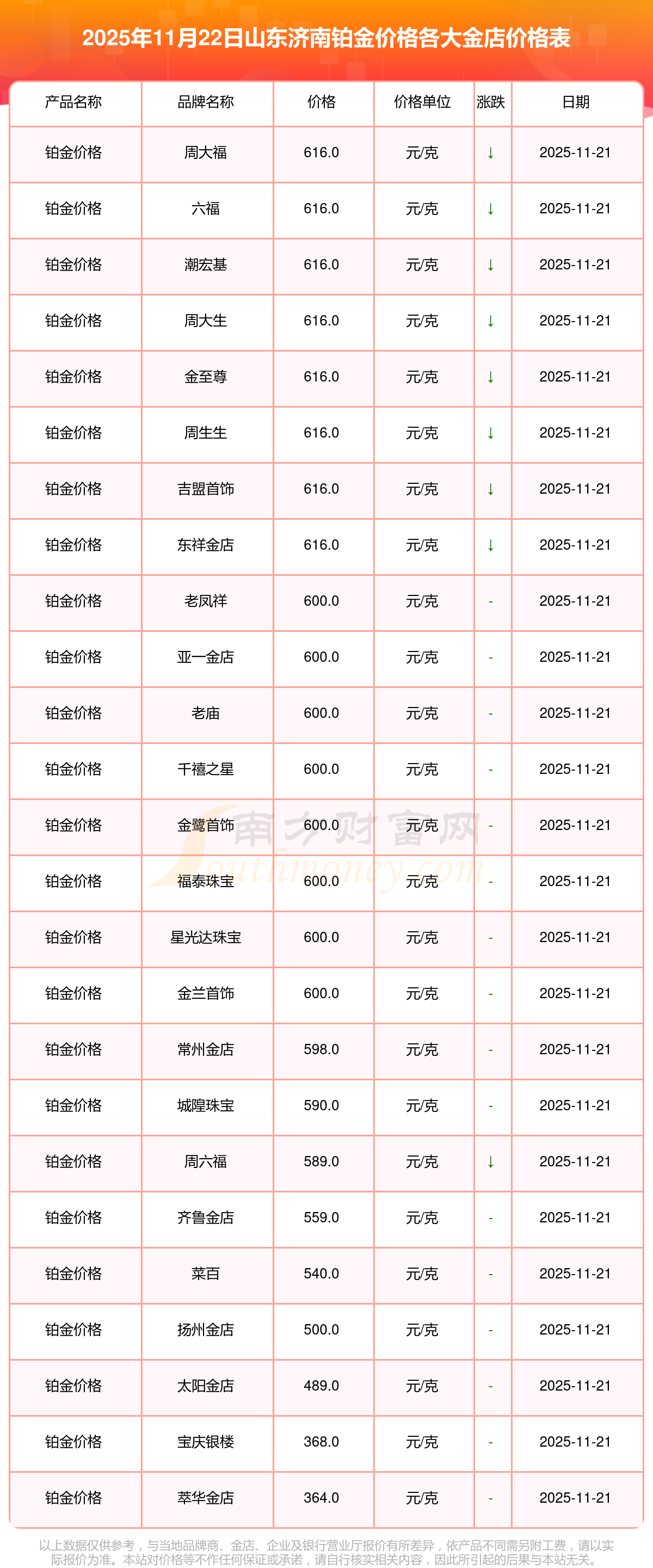 2025年11月22日山东济南各大金店铂金价格最新价格查询来了:周大福1305.0元/克,周大福616.0元/克,周大福1305.0元/克,周大福45110.0,周大福17570.0,周大福40690.0,周大福1143.0元/克,老凤祥1298.0元/克,老凤祥600.0元/克,老凤祥1298.0元/克,周六福1266.0元/克。
