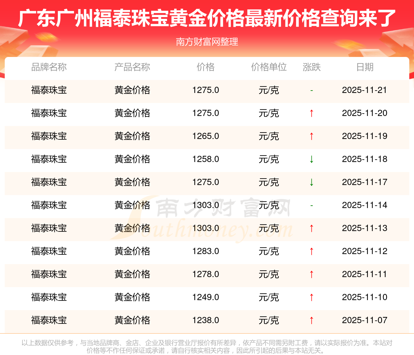 今日广东广州福泰珠宝黄金价格为1275.0元/克。
