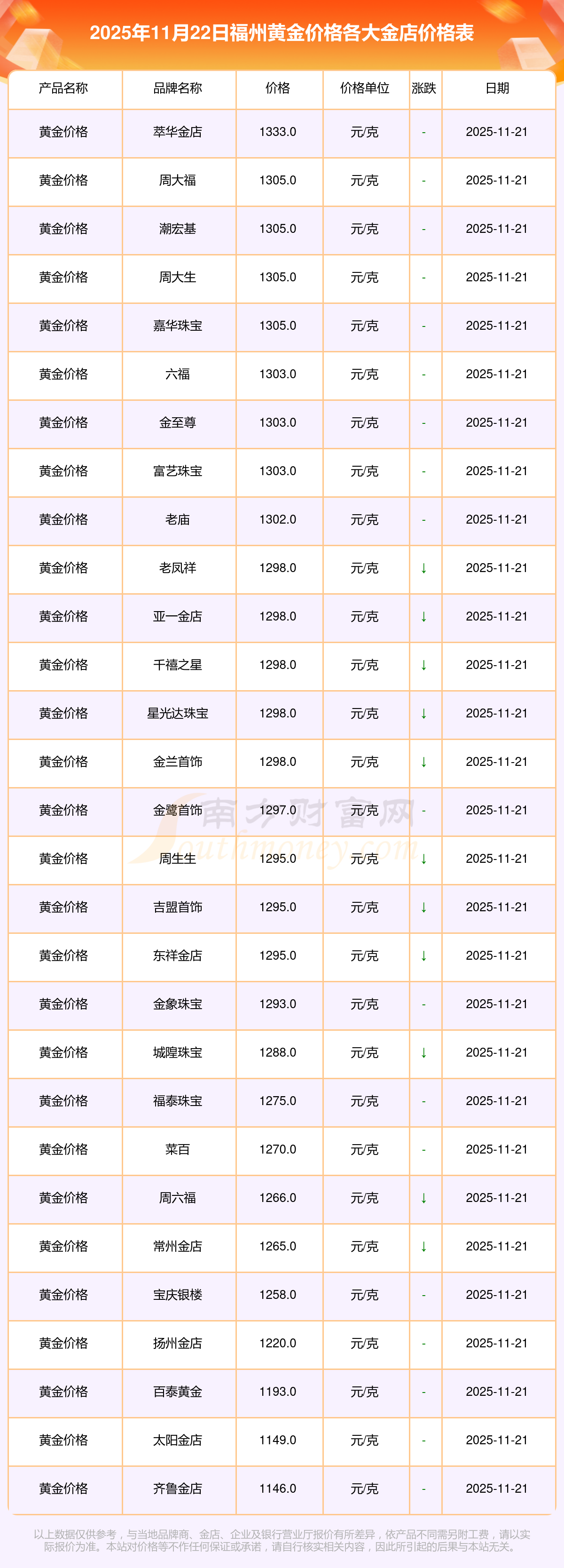 2025年11月22日,福州周大福、周大福、周大福、周大福、周大福、周大福、周大福、老凤祥、老凤祥、老凤祥、周六福等各大金店品牌黄金价格今日价格行情最新来了:周大福1305.0元/克、周大福616.0元/克、周大福1305.0元/克、周大福45110.0、周大福17570.0、周大福40690.0、周大福1143.0元/克、老凤祥1298.0元/克、老凤祥600.0元/克、老凤祥1298.0元/克、周六福1266.0元/克。