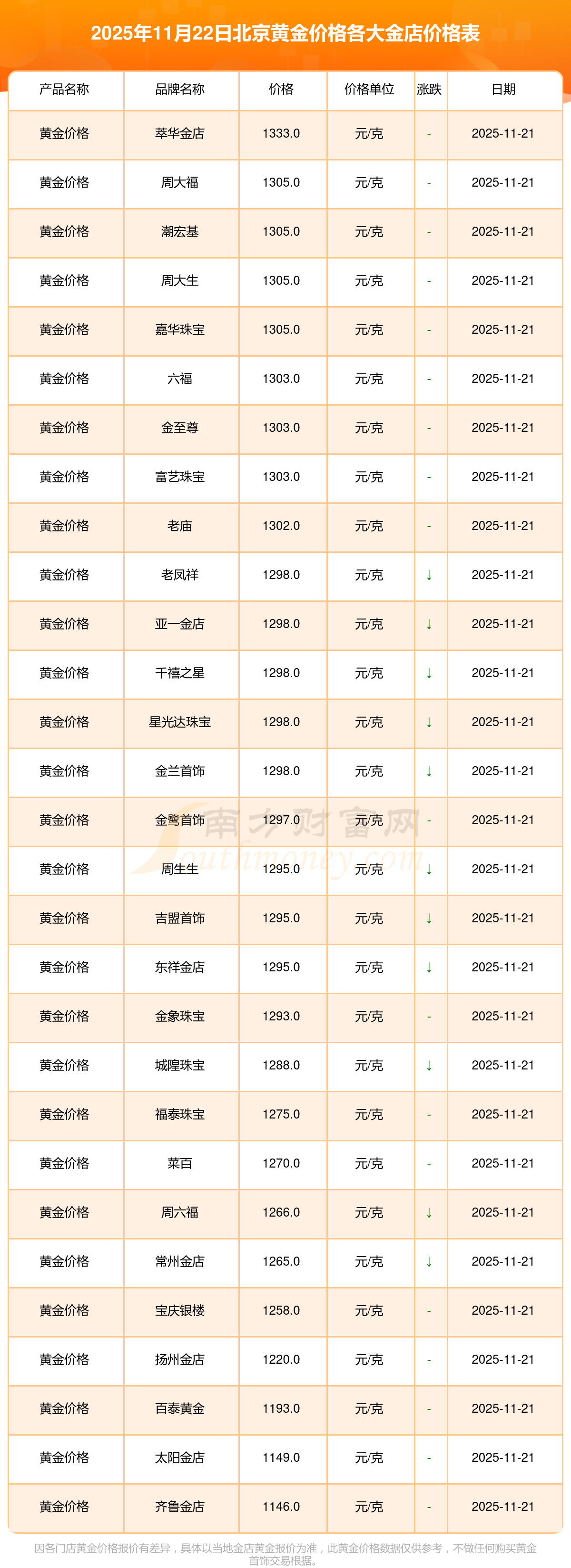 2025年11月22日,北京周大福、周大福、周大福、周大福、周大福、周大福、周大福、老凤祥、老凤祥、老凤祥、周六福等各大金店品牌黄金价格今日价格行情最新来了:周大福1305.0元/克、周大福616.0元/克、周大福1305.0元/克、周大福45110.0、周大福17570.0、周大福40690.0、周大福1143.0元/克、老凤祥1298.0元/克、老凤祥600.0元/克、老凤祥1298.0元/克、周六福1266.0元/克。
