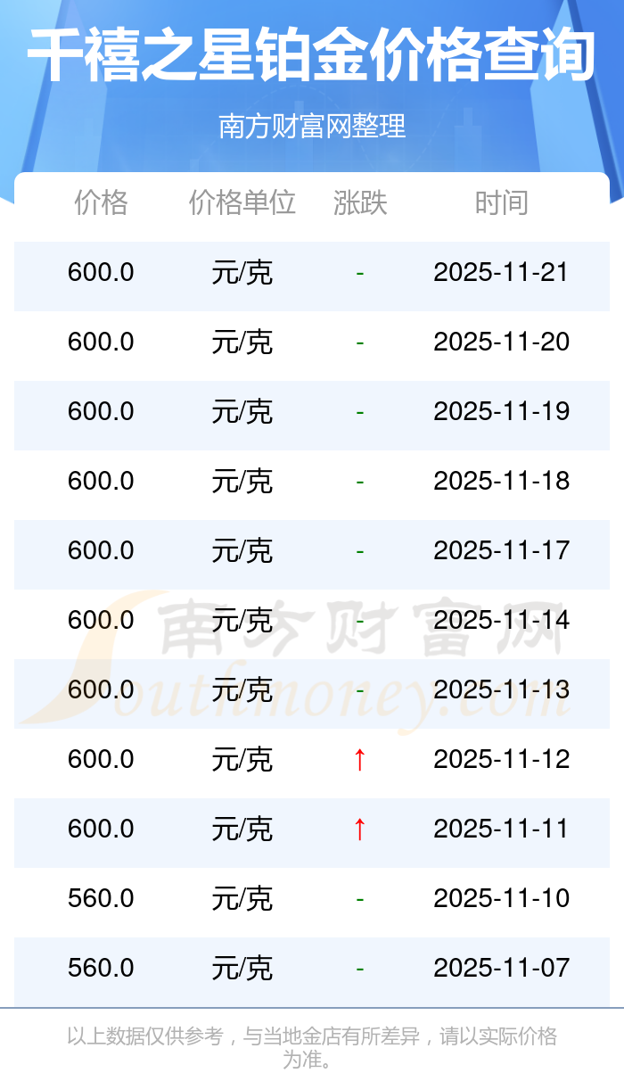 千禧之星 铂金价格今日最新的价位是600.0元/克。