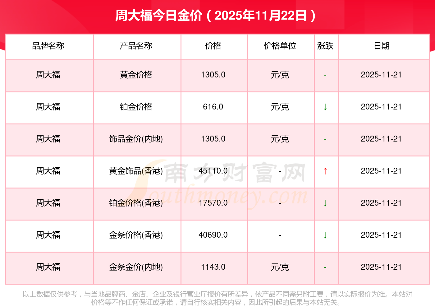 今天是2025年11月22日,周大福、周大福、周大福、周大福、周大福、周大福、周大福、老凤祥、老凤祥、老凤祥、周六福等各大金店品牌黄金价格最新价格如下:周大福1305.0元/克、周大福616.0元/克、周大福1305.0元/克、周大福45110.0、周大福17570.0、周大福40690.0、周大福1143.0元/克、老凤祥1298.0元/克、老凤祥600.0元/克、老凤祥1298.0元/克、周六福1266.0元/克。