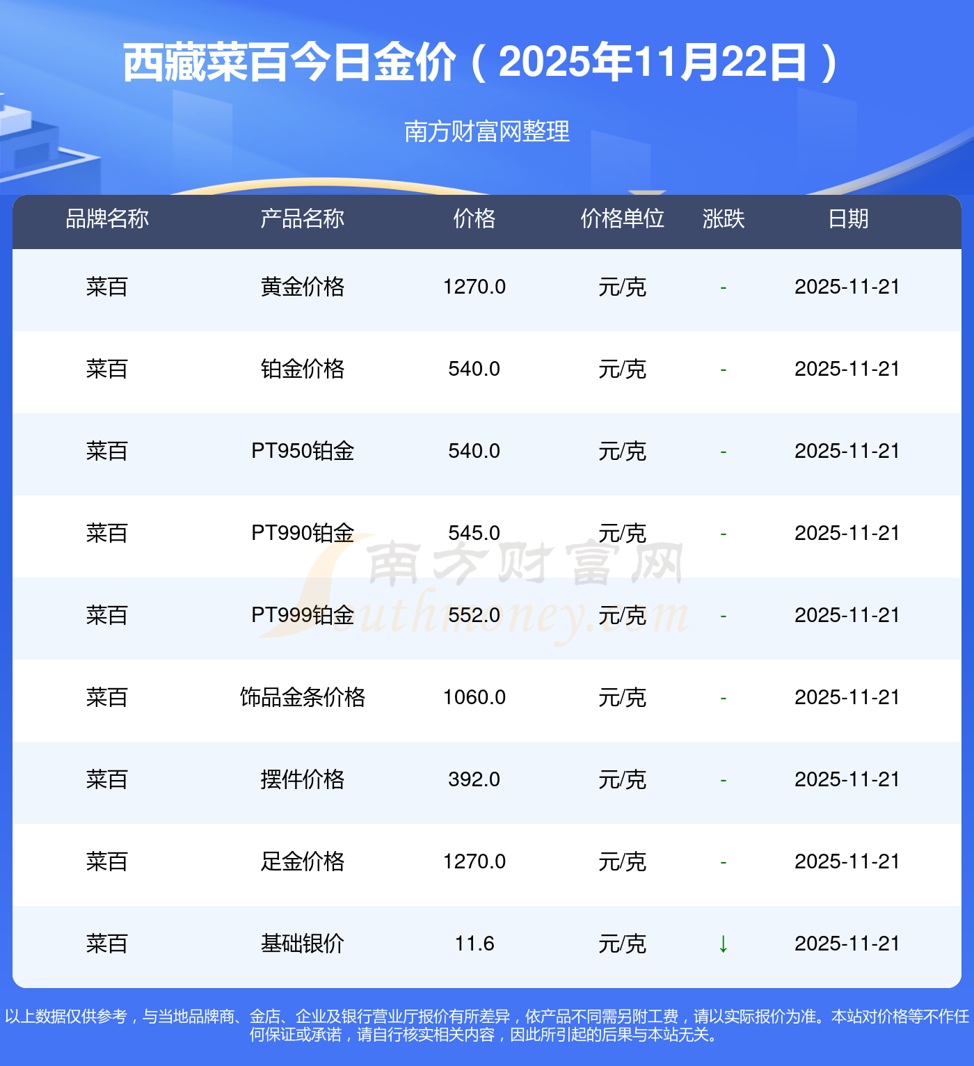 2025年11月22日西藏菜百黄金一克的市场行情价是多少?黄金价格1305.0元/克,铂金价格616.0元/克,饰品金价(内地)1305.0元/克,黄金饰品(香港)45110.0,铂金价格(香港)17570.0,金条价格(香港)40690.0,金条金价(内地)1143.0元/克,黄金价格1298.0元/克,铂金价格600.0元/克,足金价格1298.0元/克,黄金价格1266.0元/克。