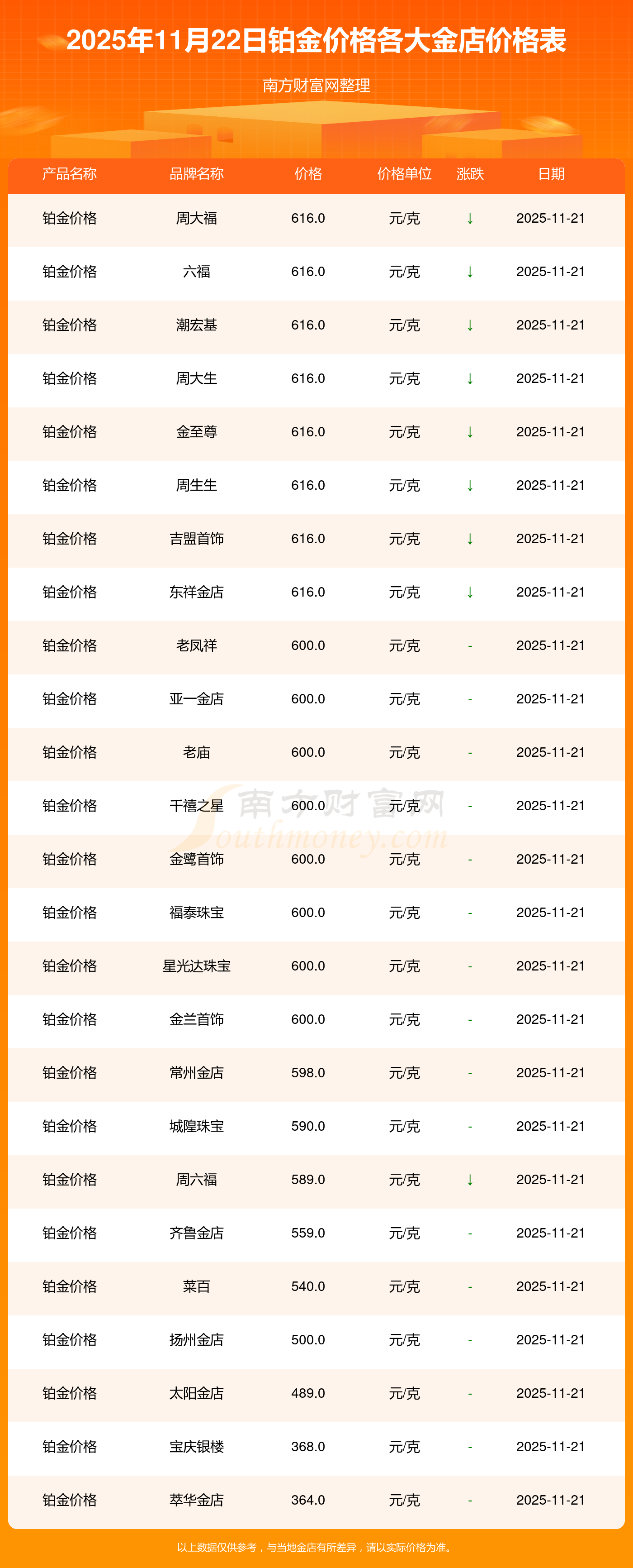 2025年11月22日周大福、周大福、周大福、周大福、周大福、周大福、周大福、老凤祥、老凤祥、老凤祥、周六福等各大金店品牌铂金价格最新价格如下:周大福黄金价格1305.0元/克,周大福铂金价格616.0元/克,周大福饰品金价(内地)1305.0元/克,周大福黄金饰品(香港)45110.0,周大福铂金价格(香港)17570.0,周大福金条价格(香港)40690.0,周大福金条金价(内地)1143.0元/克,老凤祥黄金价格1298.0元/克,老凤祥铂金价格600.0元/克,老凤祥足金价格1298.0元/克,周六福黄金价格1266.0元/克。