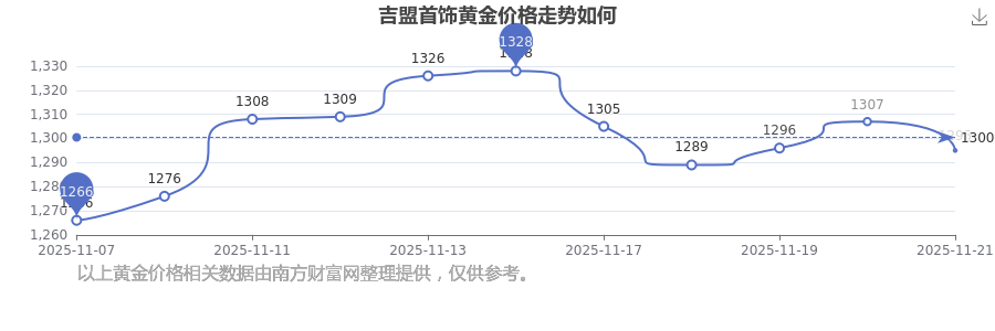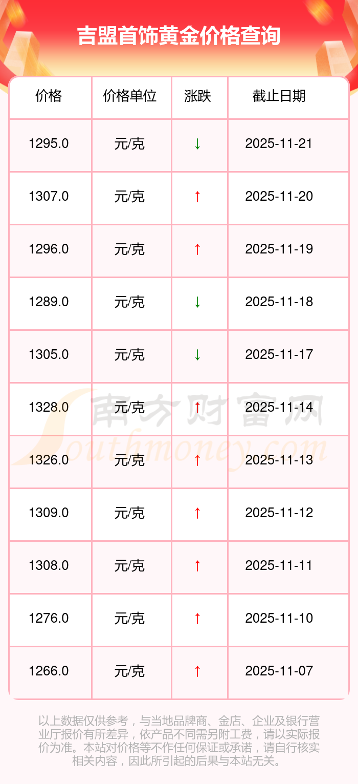 想查询今日黄金价格,当下黄金一克具体售价几何?一般情况下1克黄金的价格会在多少呢?1295.0元/克是吉盟首饰在今日给出的 黄金价格最新价格。