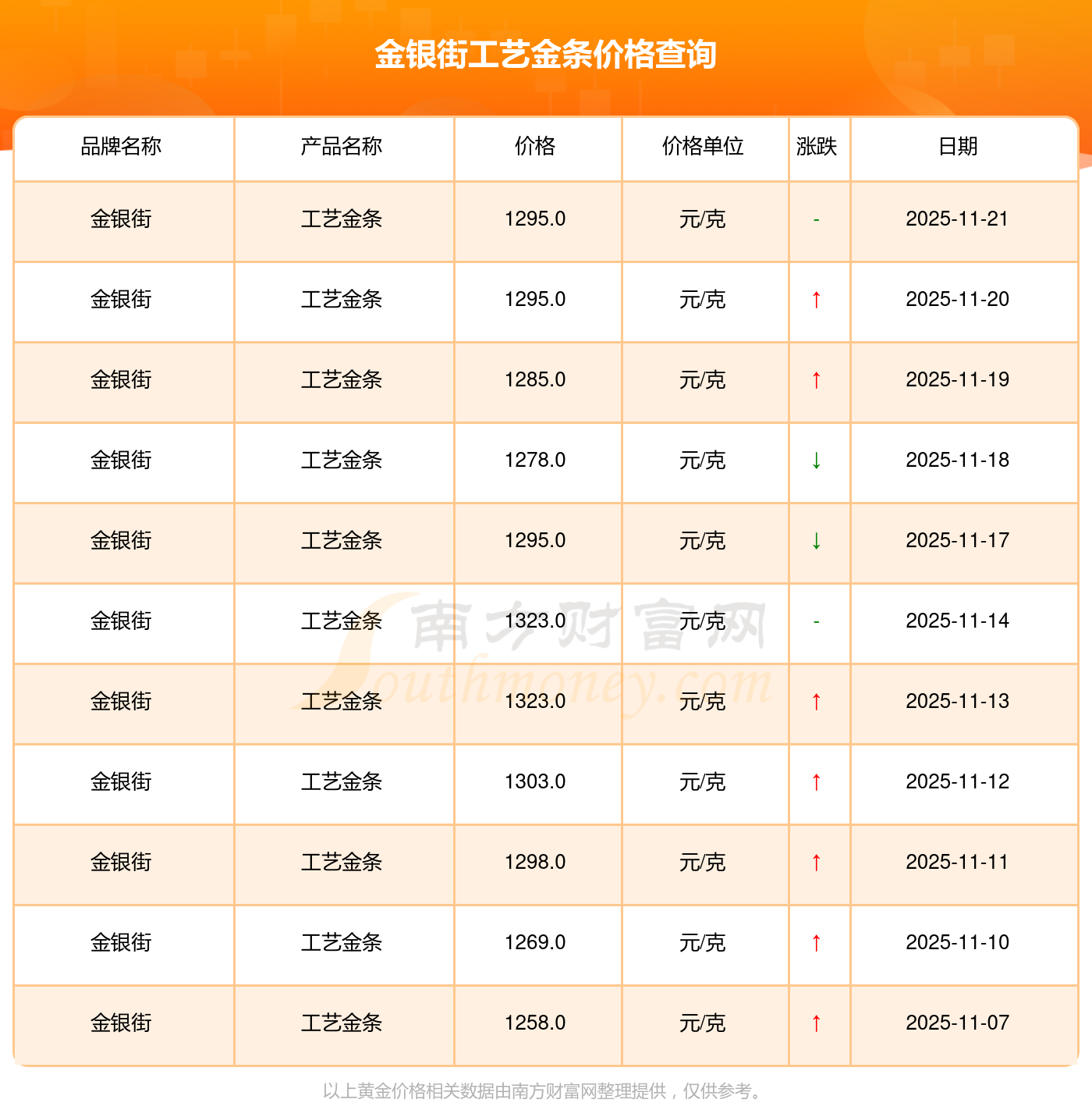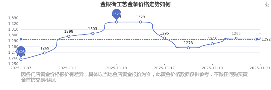 今日(2025年11月22日),金银街工艺金条最新价格为1295.0元/克。