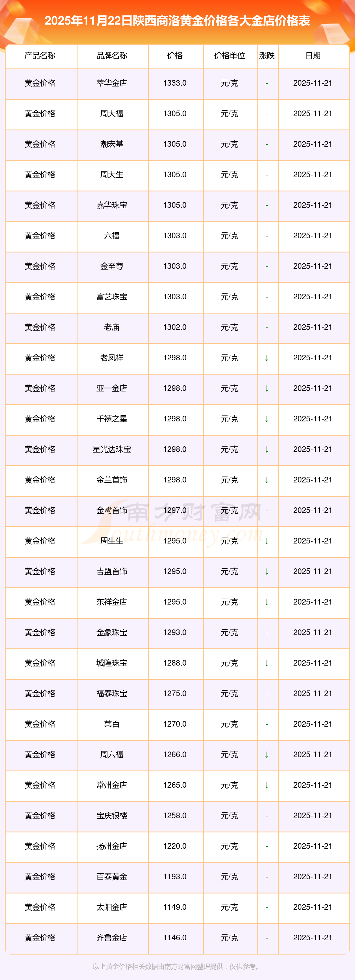 今天是2025年11月22日,陕西商洛周大福、周大福、周大福、周大福、周大福、周大福、周大福、老凤祥、老凤祥、老凤祥、周六福等各大金店品牌黄金价格最新价格行情是这样的:周大福1305.0元/克、周大福616.0元/克、周大福1305.0元/克、周大福45110.0、周大福17570.0、周大福40690.0、周大福1143.0元/克、老凤祥1298.0元/克、老凤祥600.0元/克、老凤祥1298.0元/克、周六福1266.0元/克。