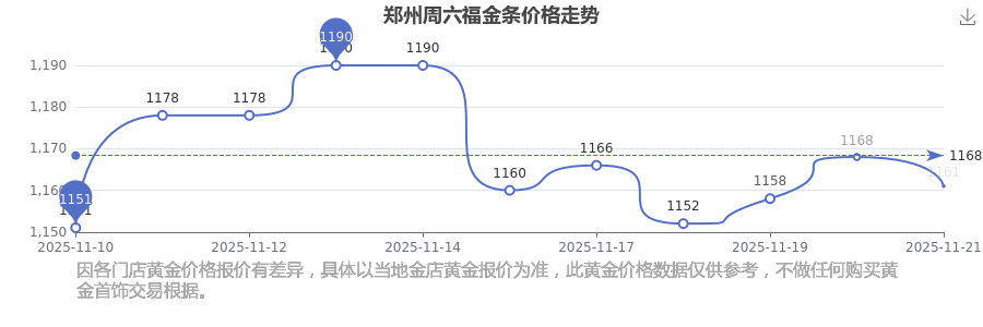 今日2025年11月22日,郑州周六福金条价格为1161.0元/克。