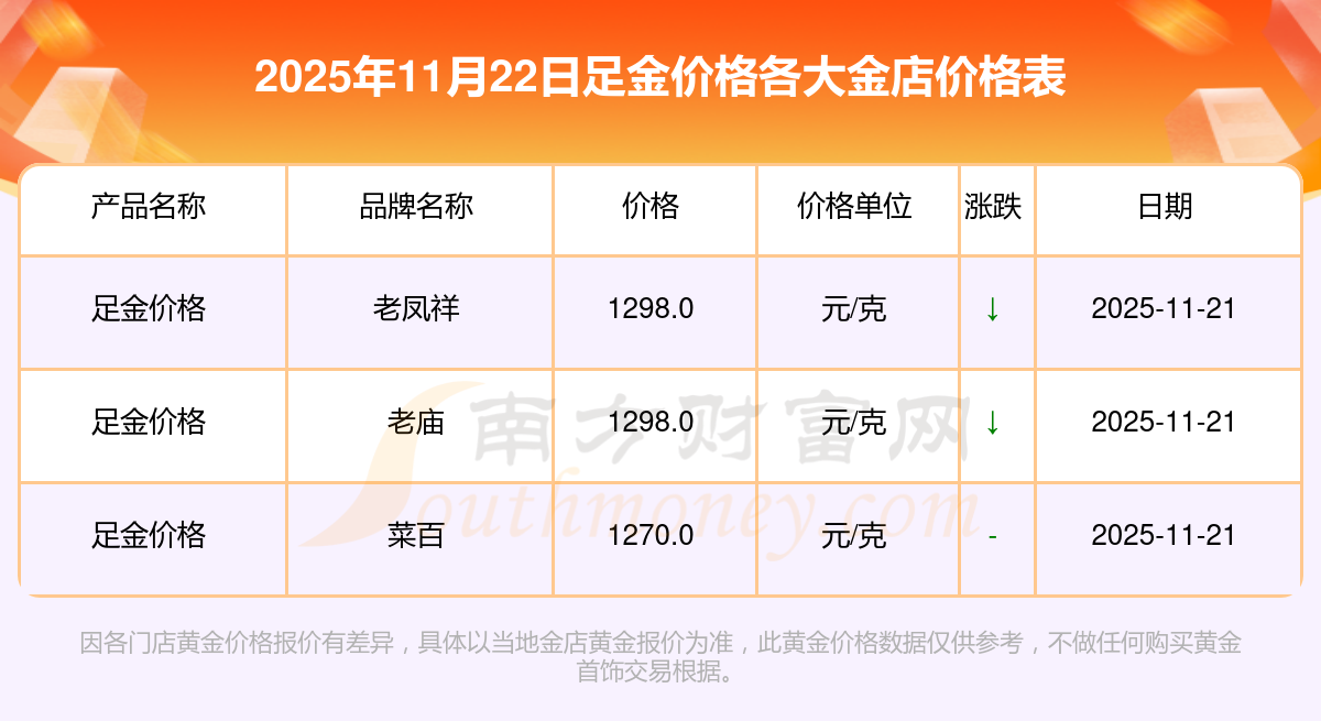 2025年11月22日各大金店足金价格最新价格:周大福1305.0元/克,周大福616.0元/克,周大福1305.0元/克,周大福45110.0,周大福17570.0,周大福40690.0,周大福1143.0元/克,老凤祥1298.0元/克,老凤祥600.0元/克,老凤祥1298.0元/克,周六福1266.0元/克。