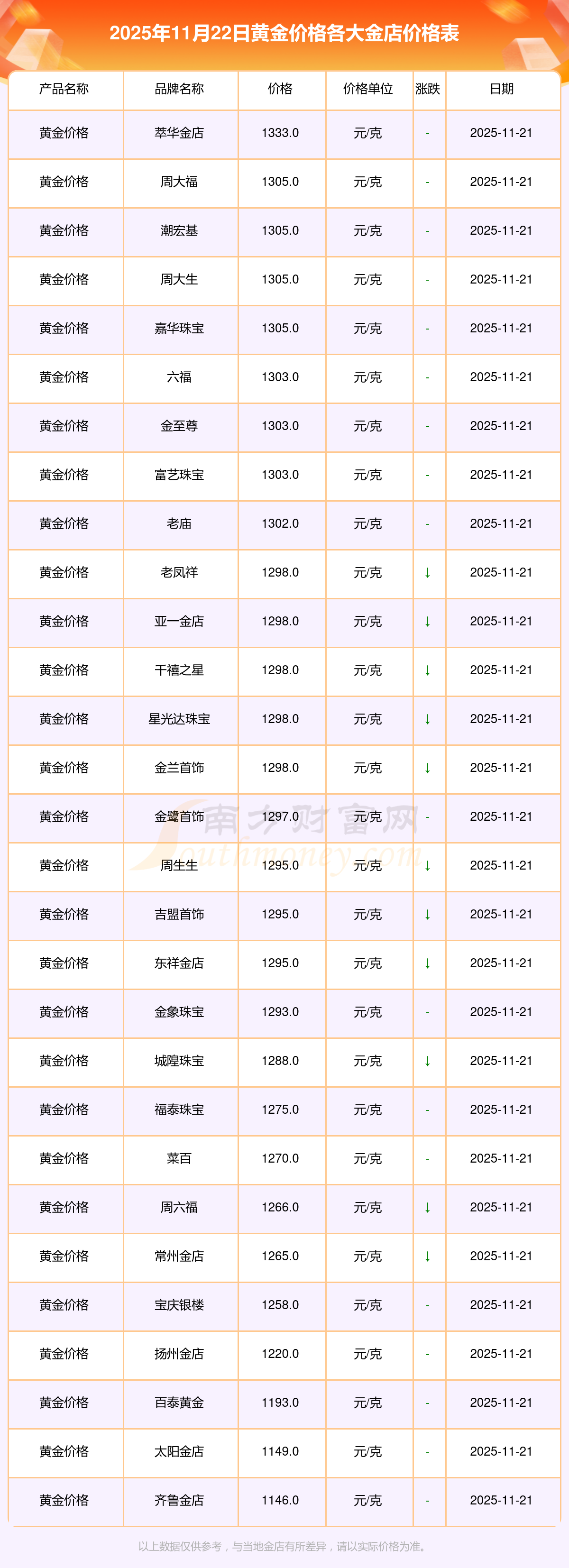 2025年11月22日,周大福、周大福、周大福、周大福、周大福、周大福、周大福、老凤祥、老凤祥、老凤祥、周六福等各大金店品牌黄金价格今日价格如下:周大福1305.0元/克、周大福616.0元/克、周大福1305.0元/克、周大福45110.0、周大福17570.0、周大福40690.0、周大福1143.0元/克、老凤祥1298.0元/克、老凤祥600.0元/克、老凤祥1298.0元/克、周六福1266.0元/克。