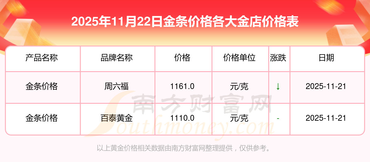 2025年11月22日周大福、周大福、周大福、周大福、周大福、周大福、周大福、老凤祥、老凤祥、老凤祥、周六福等各大金店品牌金条价格最新价格如下:周大福黄金价格1305.0元/克,周大福铂金价格616.0元/克,周大福饰品金价(内地)1305.0元/克,周大福黄金饰品(香港)45110.0,周大福铂金价格(香港)17570.0,周大福金条价格(香港)40690.0,周大福金条金价(内地)1143.0元/克,老凤祥黄金价格1298.0元/克,老凤祥铂金价格600.0元/克,老凤祥足金价格1298.0元/克,周六福黄金价格1266.0元/克。