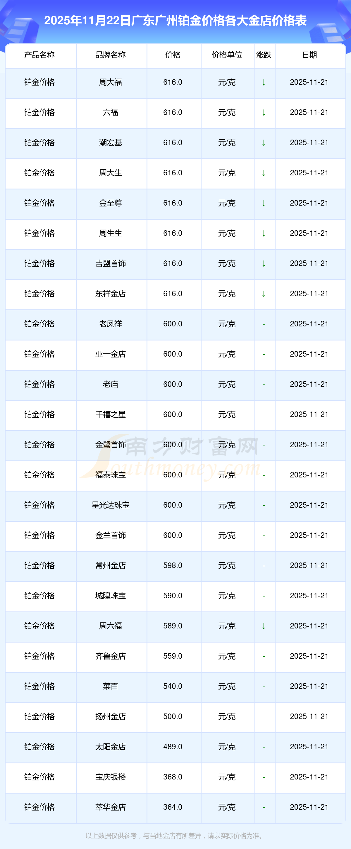 2025年11月22日广东广州各大金店铂金价格最新价格查询来了:周大福1305.0元/克,周大福616.0元/克,周大福1305.0元/克,周大福45110.0,周大福17570.0,周大福40690.0,周大福1143.0元/克,老凤祥1298.0元/克,老凤祥600.0元/克,老凤祥1298.0元/克,周六福1266.0元/克。
