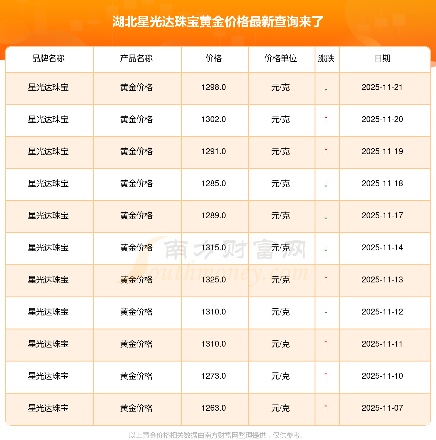 2025年11月22日,湖北星光达珠宝黄金价格每克的价值量定格在1298.0元/克。