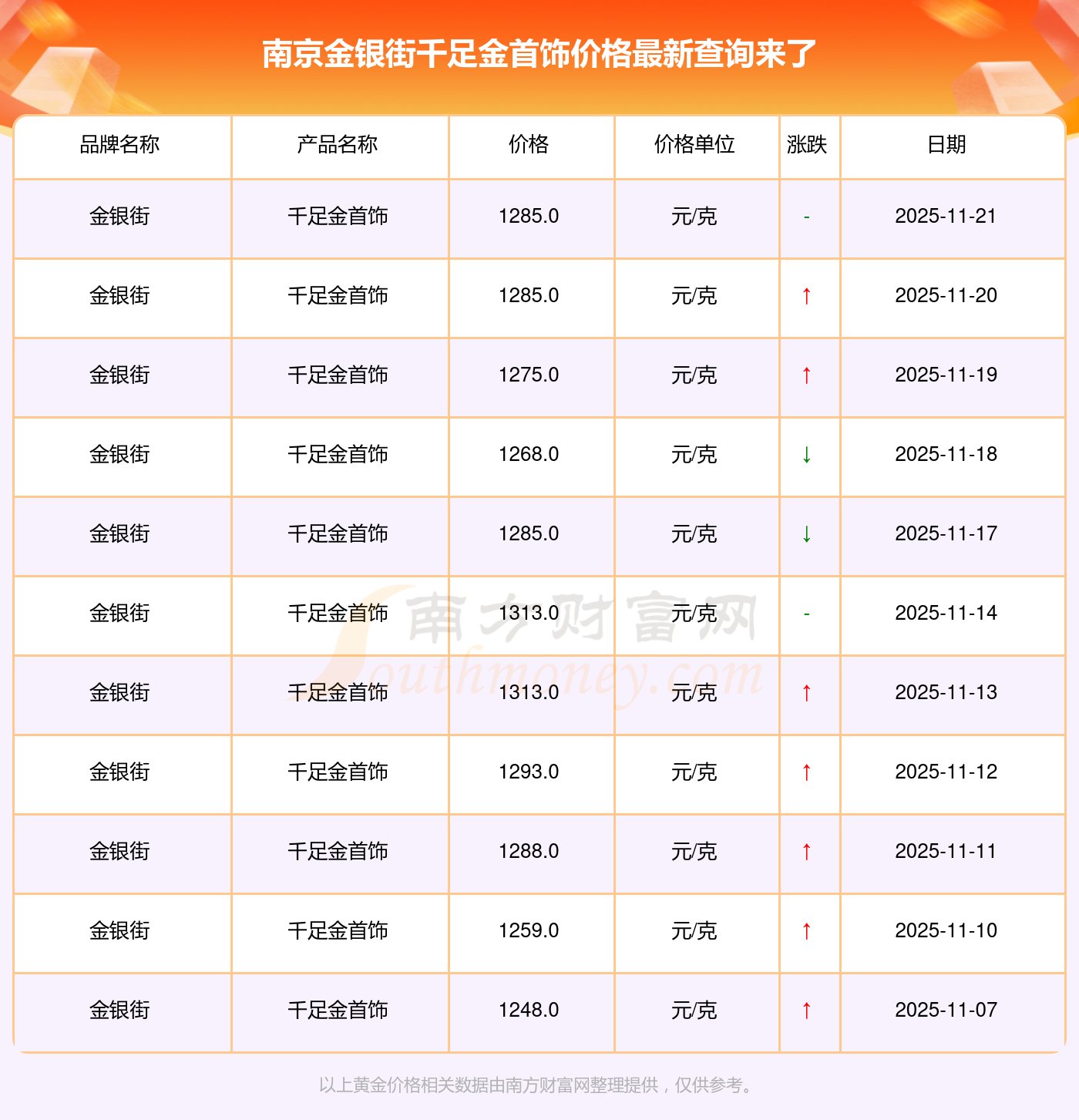 南京金银街千足金首饰在 2025年11月22日,其市场价格为 1285.0元/克。