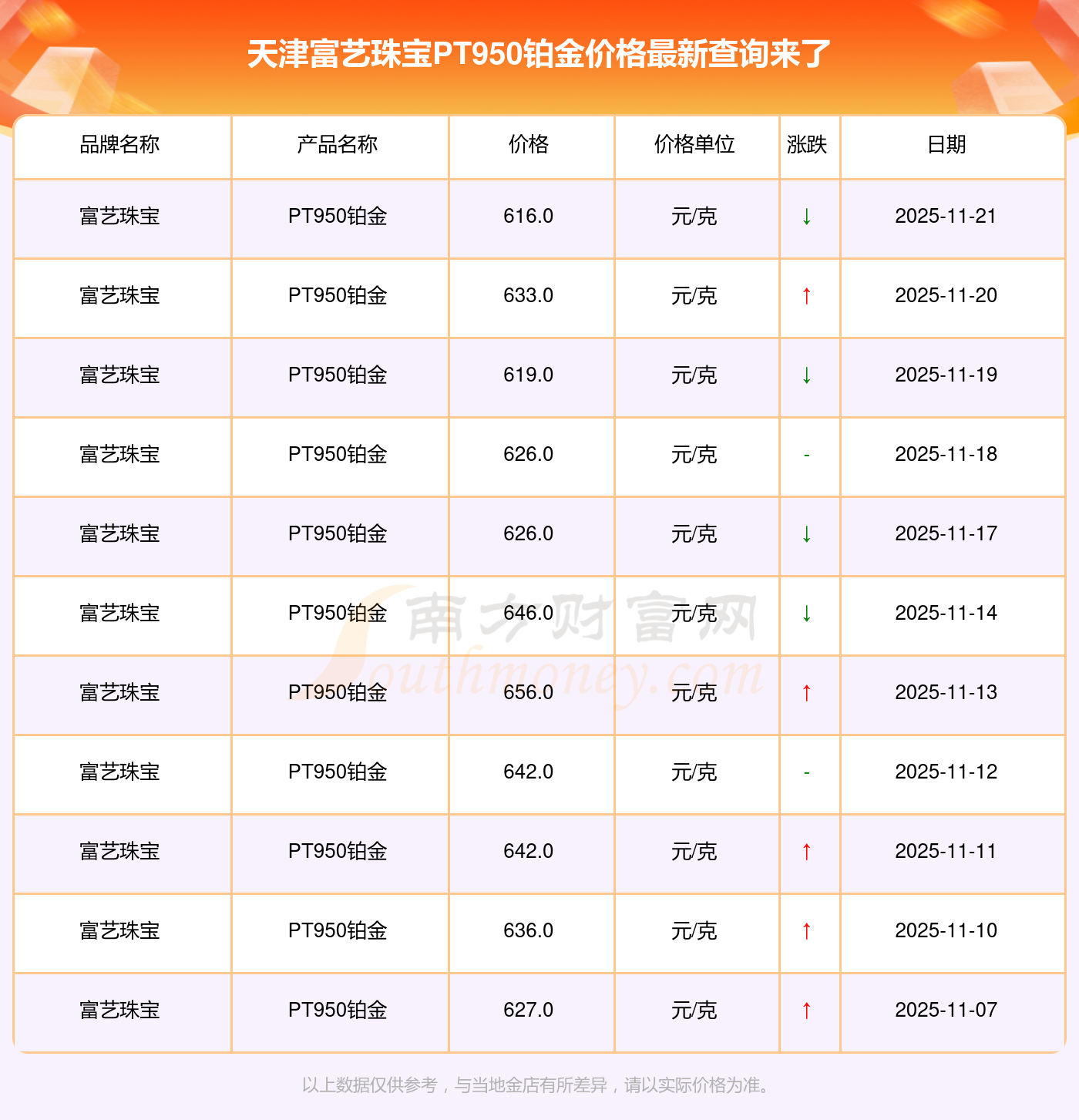 2025年11月22日各大金店PT950铂金最新价格:周大福1305.0元/克,周大福616.0元/克,周大福1305.0元/克,周大福45110.0,周大福17570.0,周大福40690.0,周大福1143.0元/克,老凤祥1298.0元/克,老凤祥600.0元/克,老凤祥1298.0元/克,周六福1266.0元/克。