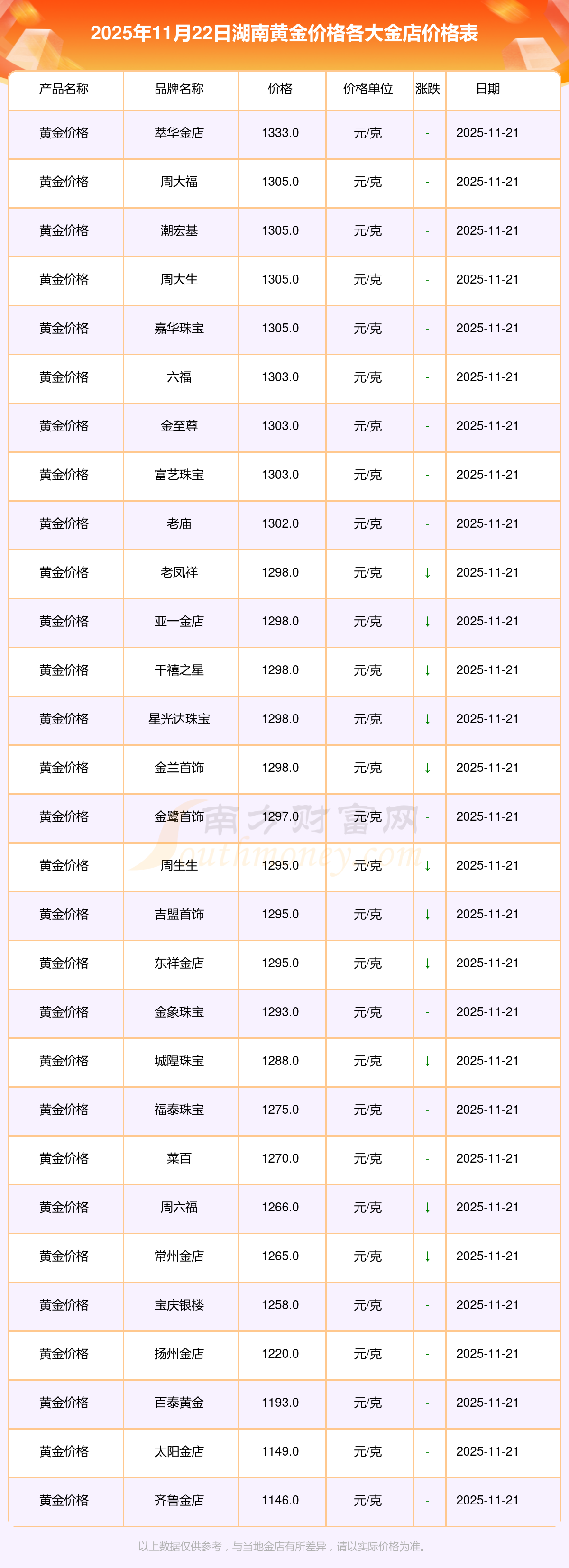2025年11月22日湖南各大金店黄金价格最新价格查询来了:周大福1305.0元/克,周大福616.0元/克,周大福1305.0元/克,周大福45110.0,周大福17570.0,周大福40690.0,周大福1143.0元/克,老凤祥1298.0元/克,老凤祥600.0元/克,老凤祥1298.0元/克,周六福1266.0元/克。