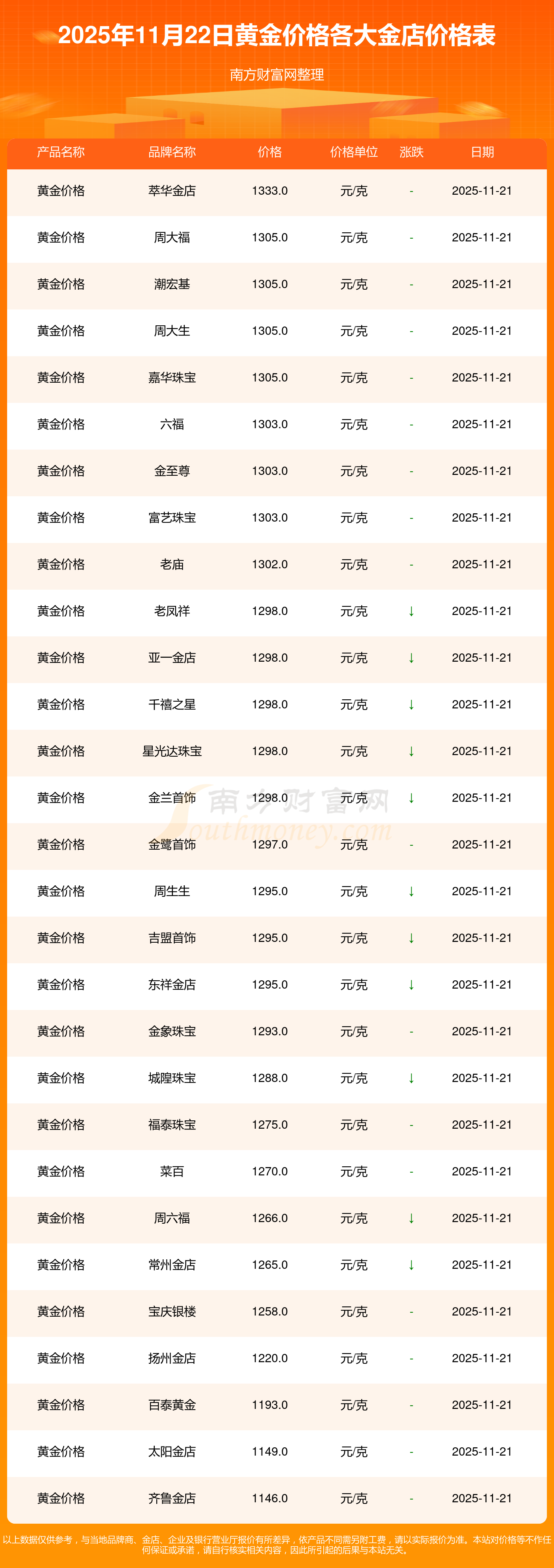 2025年11月22日,周大福、周大福、周大福、周大福、周大福、周大福、周大福、老凤祥、老凤祥、老凤祥、周六福等各大金店品牌黄金价格今日价格如下:周大福1305.0元/克、周大福616.0元/克、周大福1305.0元/克、周大福45110.0、周大福17570.0、周大福40690.0、周大福1143.0元/克、老凤祥1298.0元/克、老凤祥600.0元/克、老凤祥1298.0元/克、周六福1266.0元/克。