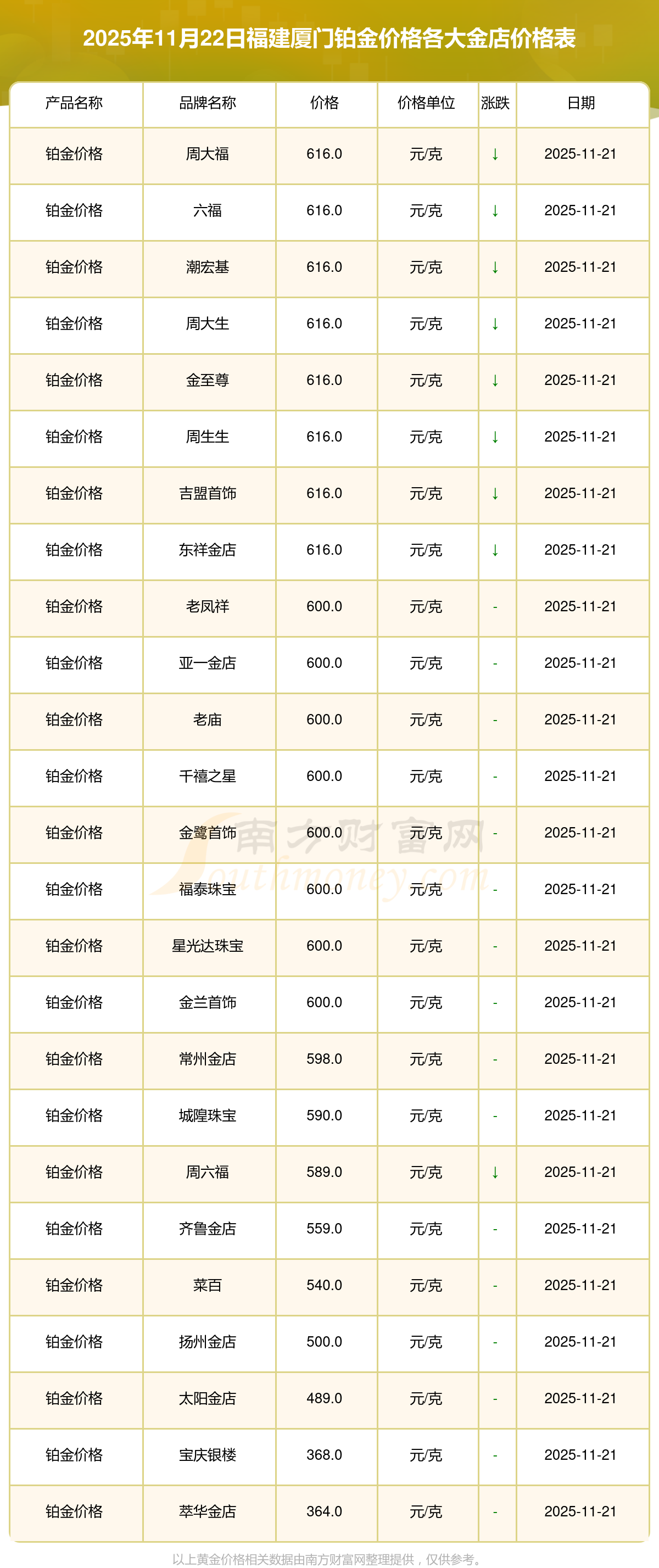 今天是2025年11月22日,福建厦门周大福、周大福、周大福、周大福、周大福、周大福、周大福、老凤祥、老凤祥、老凤祥、周六福等各大金店品牌铂金价格最新价格行情是这样的:周大福1305.0元/克、周大福616.0元/克、周大福1305.0元/克、周大福45110.0、周大福17570.0、周大福40690.0、周大福1143.0元/克、老凤祥1298.0元/克、老凤祥600.0元/克、老凤祥1298.0元/克、周六福1266.0元/克。