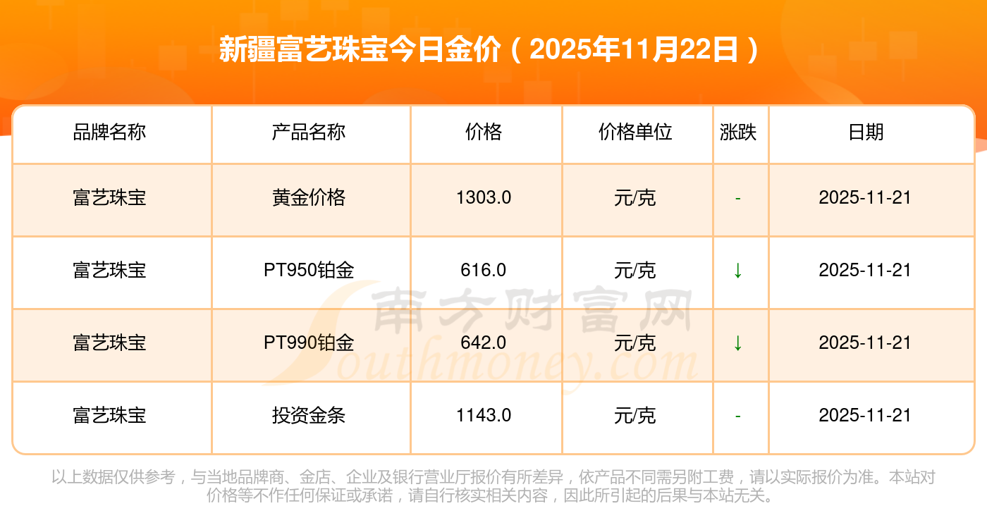 2025年11月22日新疆富艺珠宝金价查询:黄金价格1305.0元/克,铂金价格616.0元/克,饰品金价(内地)1305.0元/克,黄金饰品(香港)45110.0,铂金价格(香港)17570.0,金条价格(香港)40690.0,金条金价(内地)1143.0元/克,黄金价格1298.0元/克,铂金价格600.0元/克,足金价格1298.0元/克,黄金价格1266.0元/克。