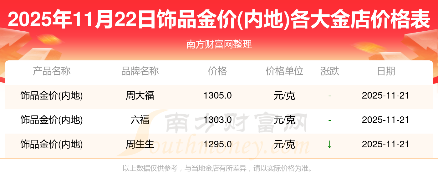 2025年11月22日周大福、周大福、周大福、周大福、周大福、周大福、周大福、老凤祥、老凤祥、老凤祥、周六福等各大金店品牌饰品金价(内地)最新价格如下:周大福黄金价格1305.0元/克,周大福铂金价格616.0元/克,周大福饰品金价(内地)1305.0元/克,周大福黄金饰品(香港)45110.0,周大福铂金价格(香港)17570.0,周大福金条价格(香港)40690.0,周大福金条金价(内地)1143.0元/克,老凤祥黄金价格1298.0元/克,老凤祥铂金价格600.0元/克,老凤祥足金价格1298.0元/克,周六福黄金价格1266.0元/克。