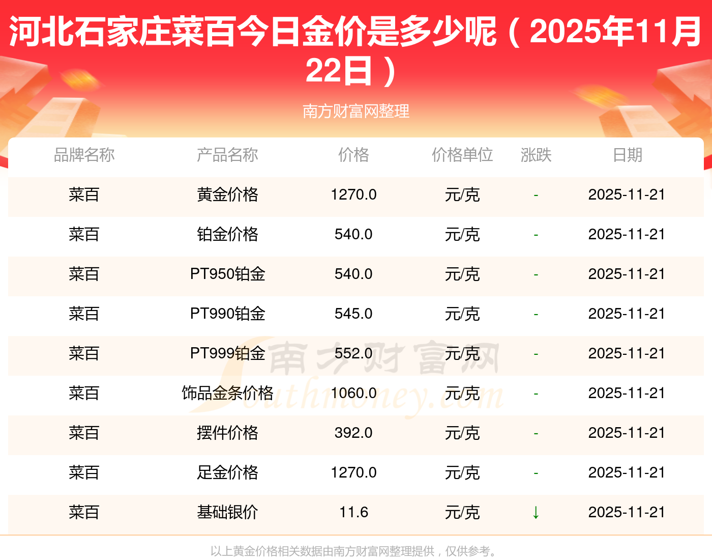 想查询今日黄金价格,当下黄金一克具体售价几何?2025年11月22日河北石家庄菜百黄金一克的市场行情价是多少?黄金价格1305.0元/克,铂金价格616.0元/克,饰品金价(内地)1305.0元/克,黄金饰品(香港)45110.0,铂金价格(香港)17570.0,金条价格(香港)40690.0,金条金价(内地)1143.0元/克,黄金价格1298.0元/克,铂金价格600.0元/克,足金价格1298.0元/克,黄金价格1266.0元/克。