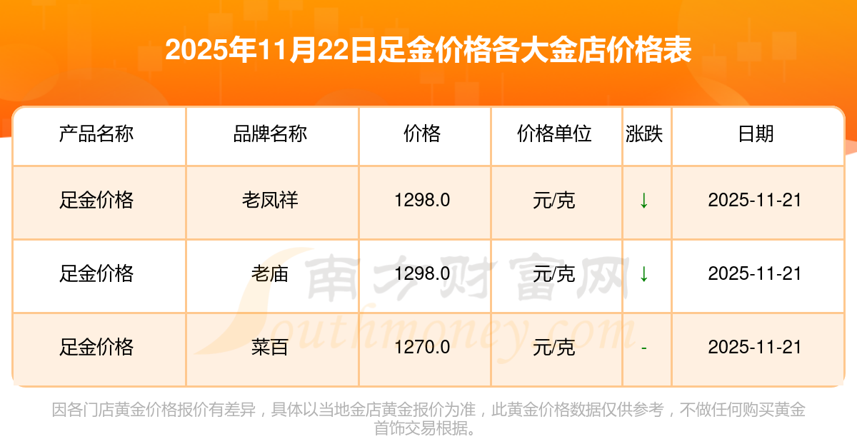 2025年11月22日周大福、周大福、周大福、周大福、周大福、周大福、周大福、老凤祥、老凤祥、老凤祥、周六福等各大金店品牌足金价格最新价格如下:周大福黄金价格1305.0元/克,周大福铂金价格616.0元/克,周大福饰品金价(内地)1305.0元/克,周大福黄金饰品(香港)45110.0,周大福铂金价格(香港)17570.0,周大福金条价格(香港)40690.0,周大福金条金价(内地)1143.0元/克,老凤祥黄金价格1298.0元/克,老凤祥铂金价格600.0元/克,老凤祥足金价格1298.0元/克,周六福黄金价格1266.0元/克。