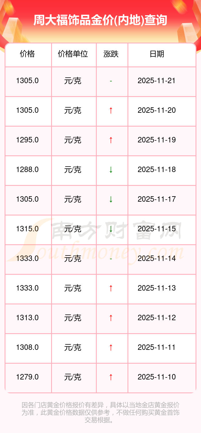 1305.0元/克成为周大福今日 饰品金价(内地)的最新交易的价格。