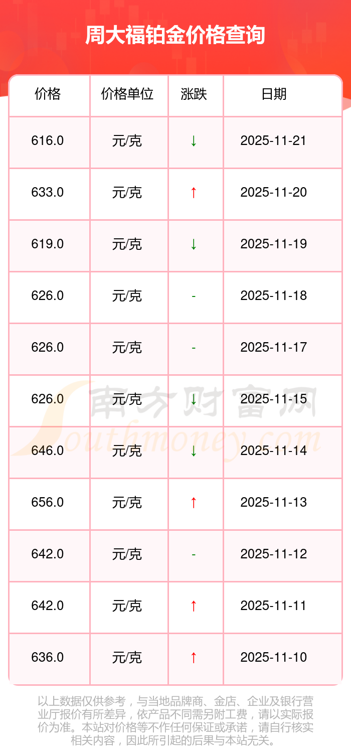 今日周大福 铂金价格,最新确定为616.0元/克。