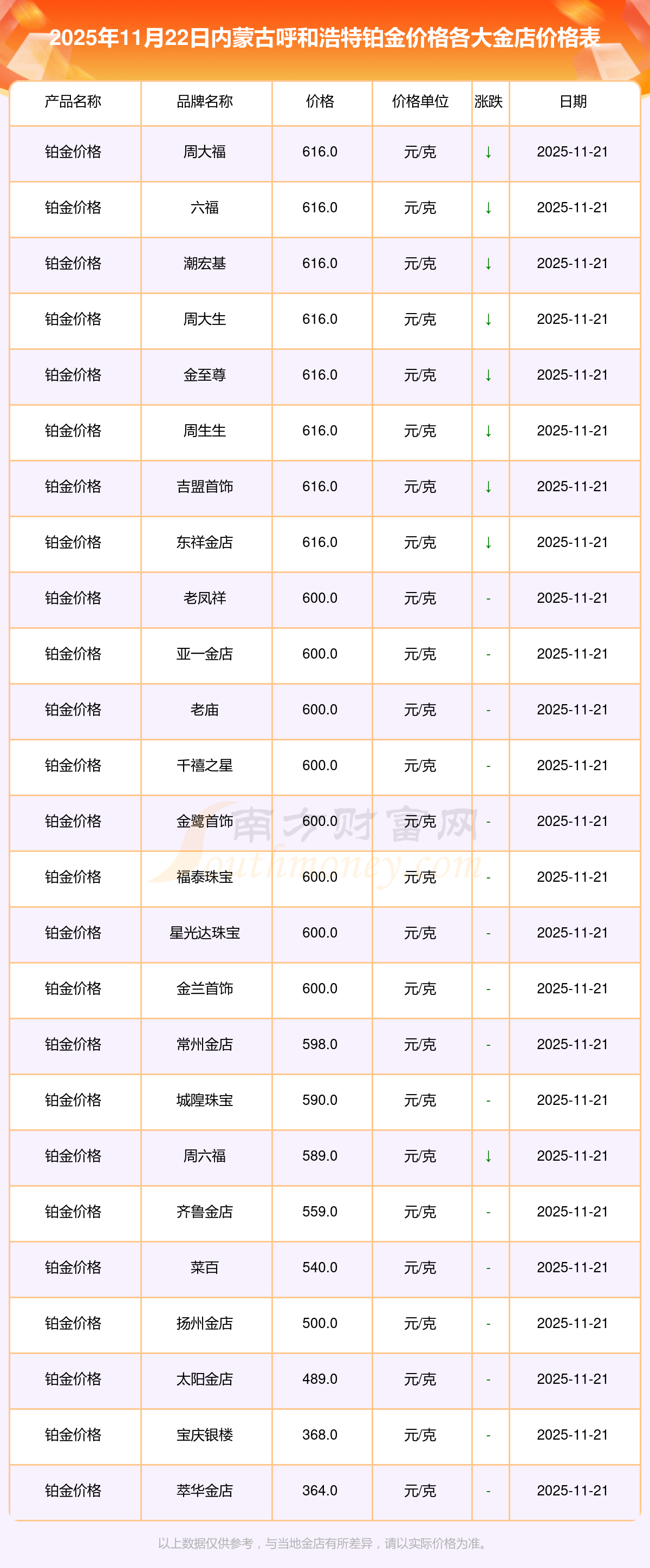 2025年11月22日内蒙古呼和浩特周大福、周大福、周大福、周大福、周大福、周大福、周大福、老凤祥、老凤祥、老凤祥、周六福等各大金店品牌铂金价格最新价格行情来了,如下:周大福黄金价格1305.0元/克,周大福铂金价格616.0元/克,周大福饰品金价(内地)1305.0元/克,周大福黄金饰品(香港)45110.0,周大福铂金价格(香港)17570.0,周大福金条价格(香港)40690.0,周大福金条金价(内地)1143.0元/克,老凤祥黄金价格1298.0元/克,老凤祥铂金价格600.0元/克,老凤祥足金价格1298.0元/克,周六福黄金价格1266.0元/克。
