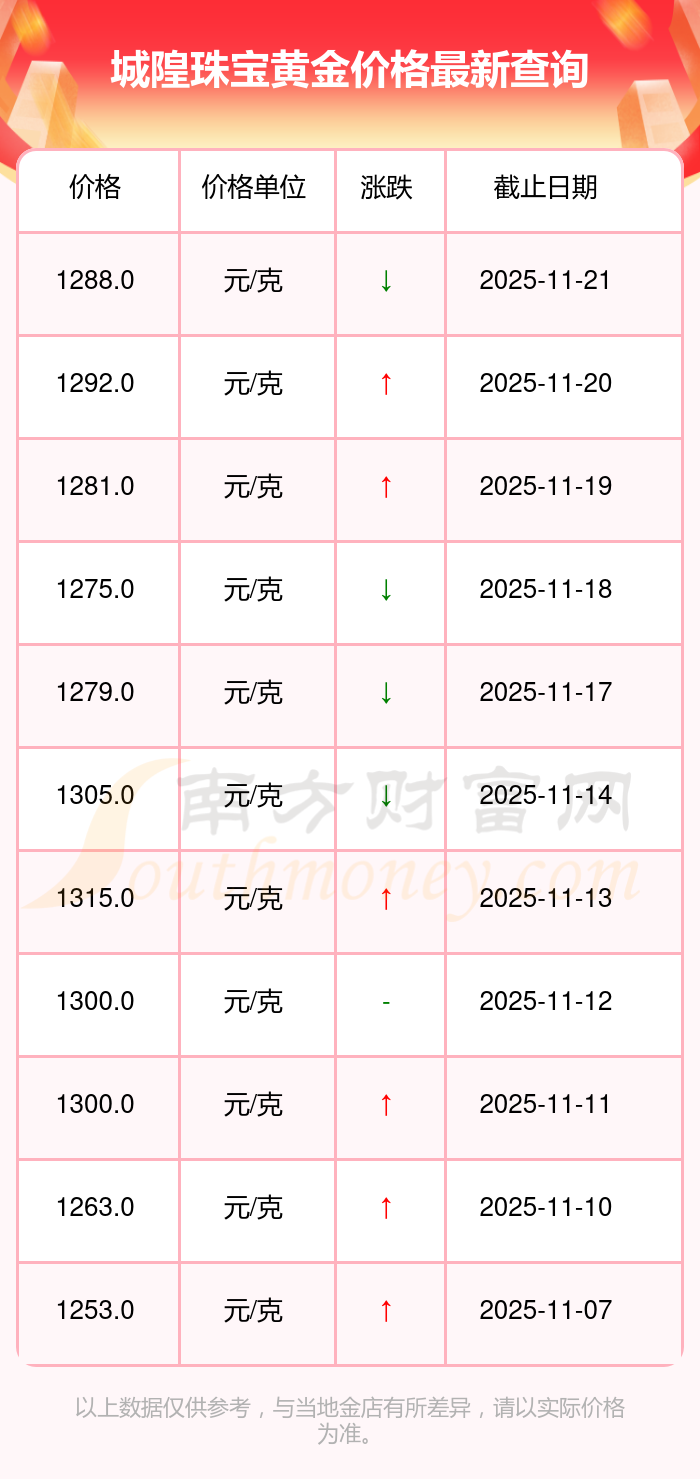 想知道今日黄金价格,目前黄金一克的价钱是多少呀?黄金是一种优良的导电导热材料,具有良好的导热特性。黄金常用于电子工业中的特殊电路设计,因其化学稳定性高、抗氧化性强,可制作高精度电子元件。今日(2025年11月22日)城隍珠宝黄金价格的价格为1288.0元/克。