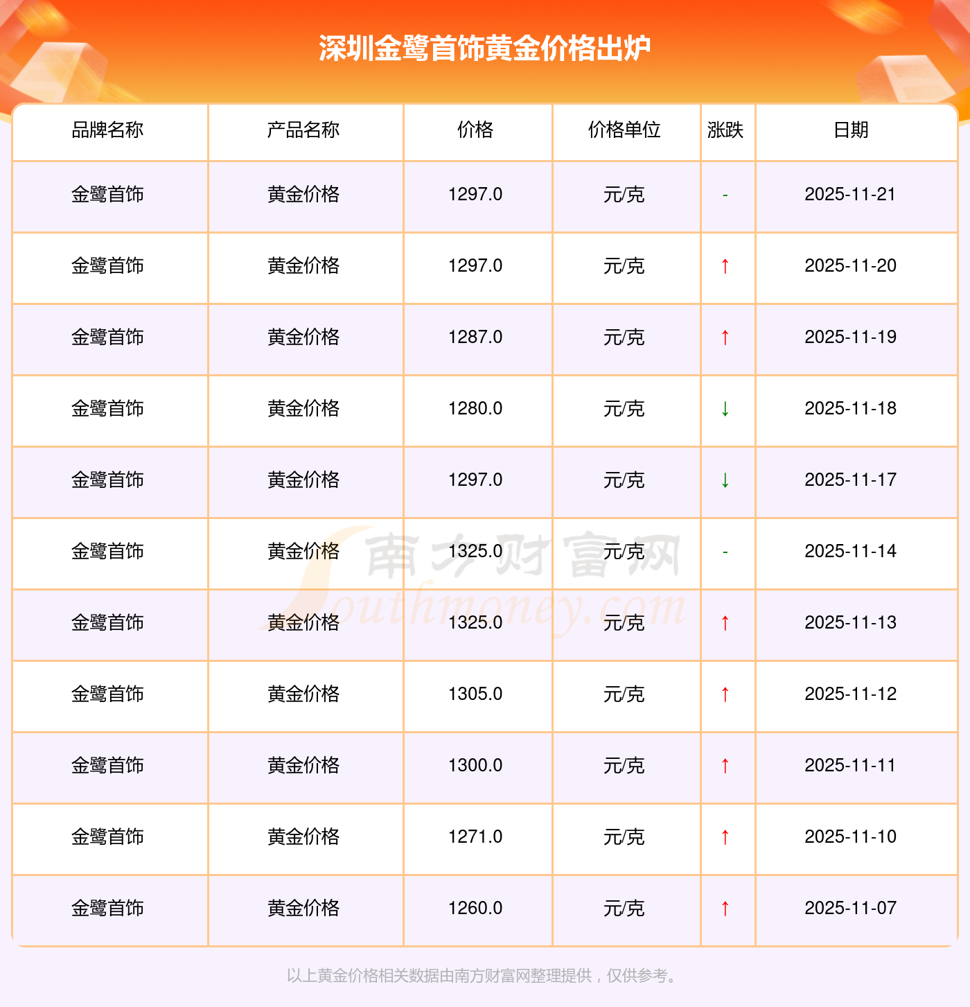 深圳金鹭首饰 2025年11月22日的黄金价格价位为 1297.0元/克。