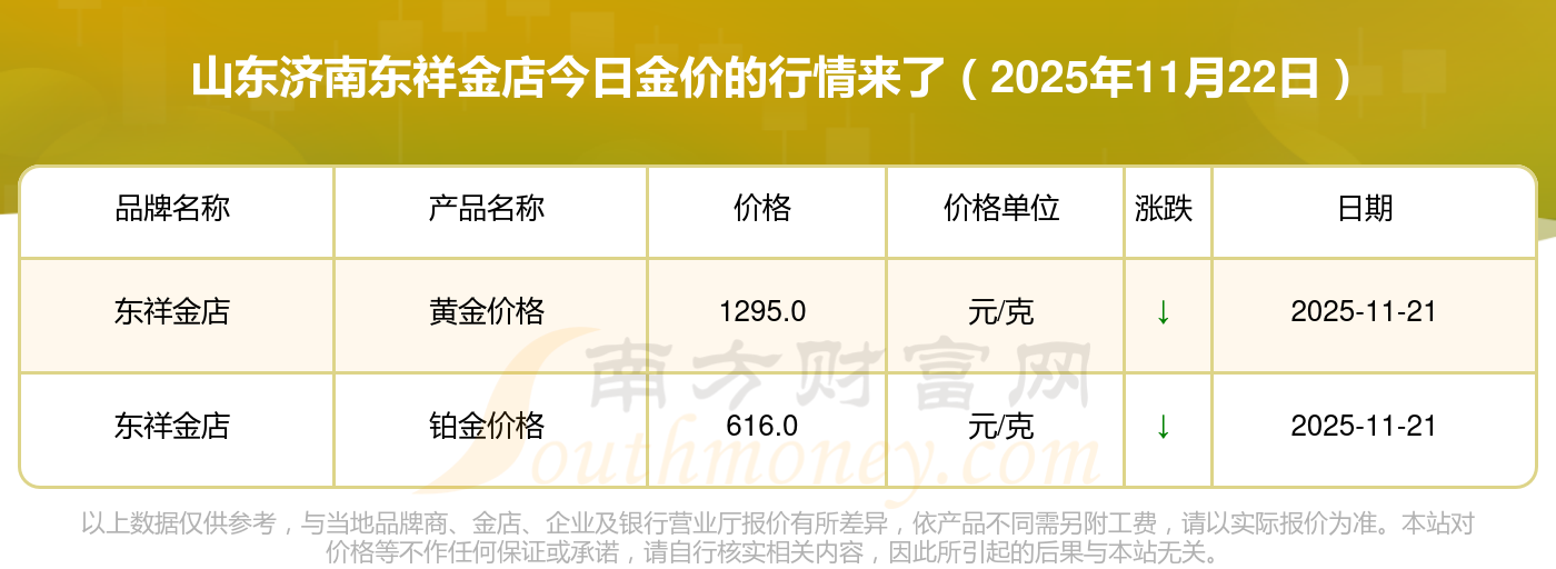 今日黄金价格情况如何?此刻黄金一克要多少钱?2025年11月22日山东济南东祥金店黄金的单价,一克为多少?黄金价格1305.0元/克,铂金价格616.0元/克,饰品金价(内地)1305.0元/克,黄金饰品(香港)45110.0,铂金价格(香港)17570.0,金条价格(香港)40690.0,金条金价(内地)1143.0元/克,黄金价格1298.0元/克,铂金价格600.0元/克,足金价格1298.0元/克,黄金价格1266.0元/克。