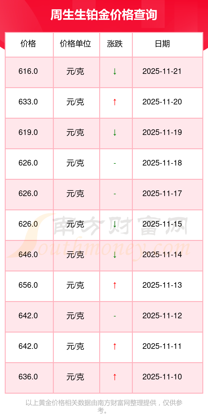 2025年11月22日周生生铂金价格为616.0元/克。